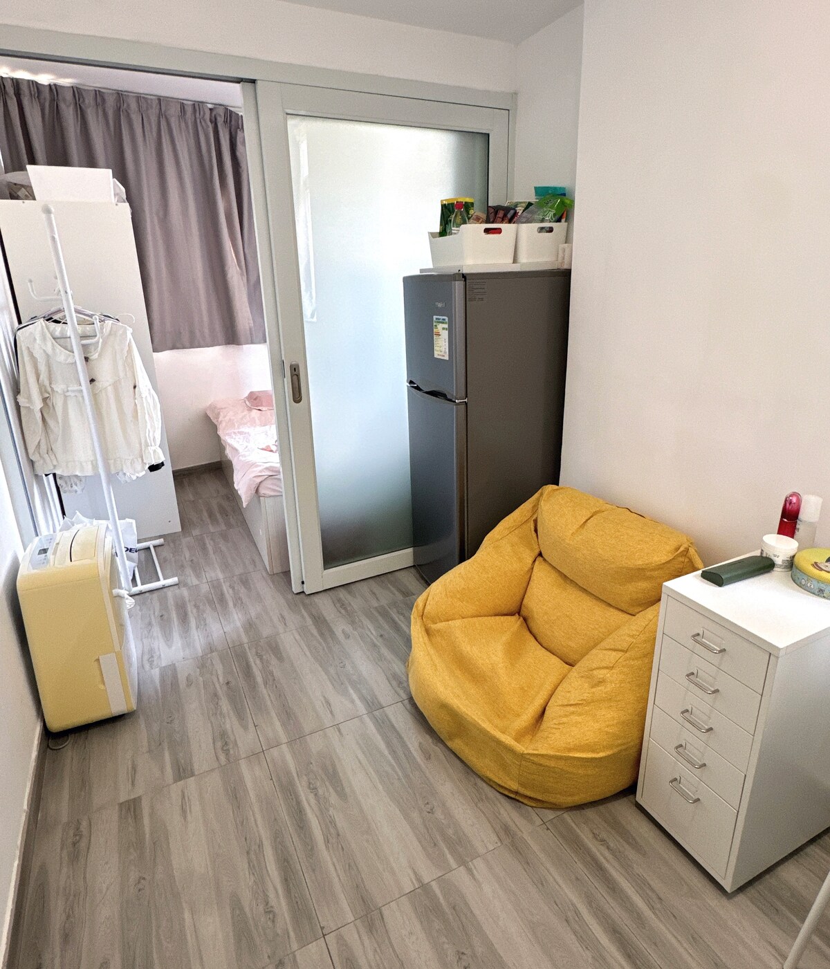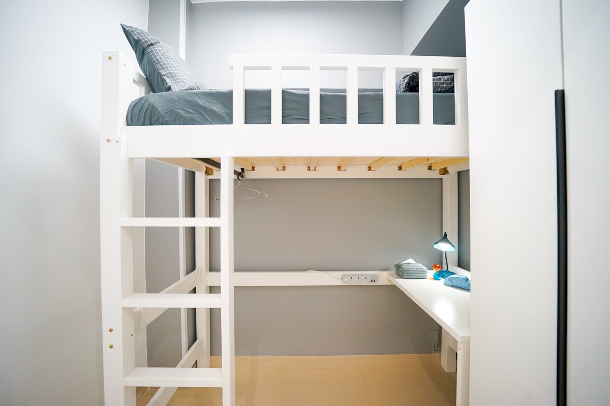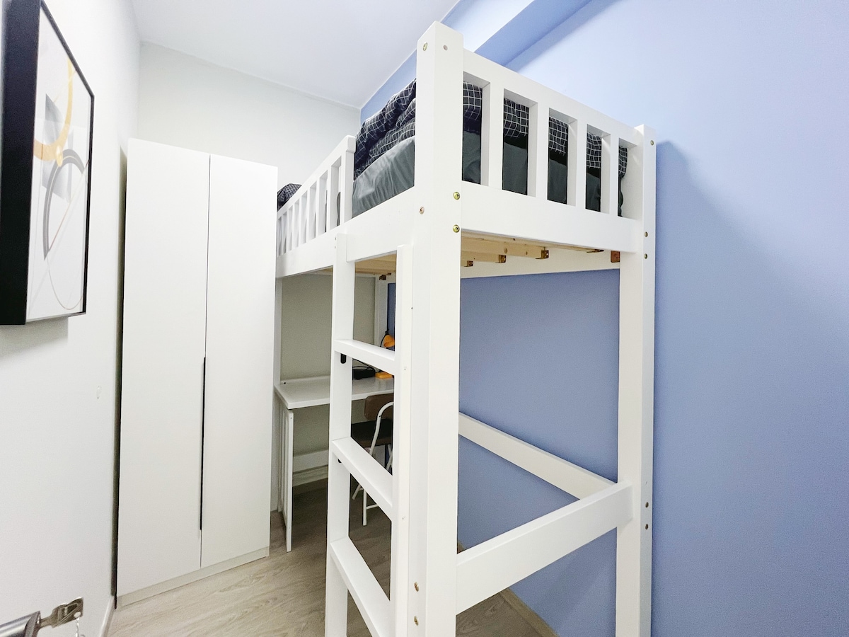 This is our shared dormitory, Cozy Out-Fitted private room you are looking at is a single bunk bedroom without window! This room equipped with a single high bunk bed 80cm x 183cm & a desk, a cloth hanger! Note: This is a no window room equipped with ventilation fan and sharing the AC from the living room! Please note this before booking ^^!