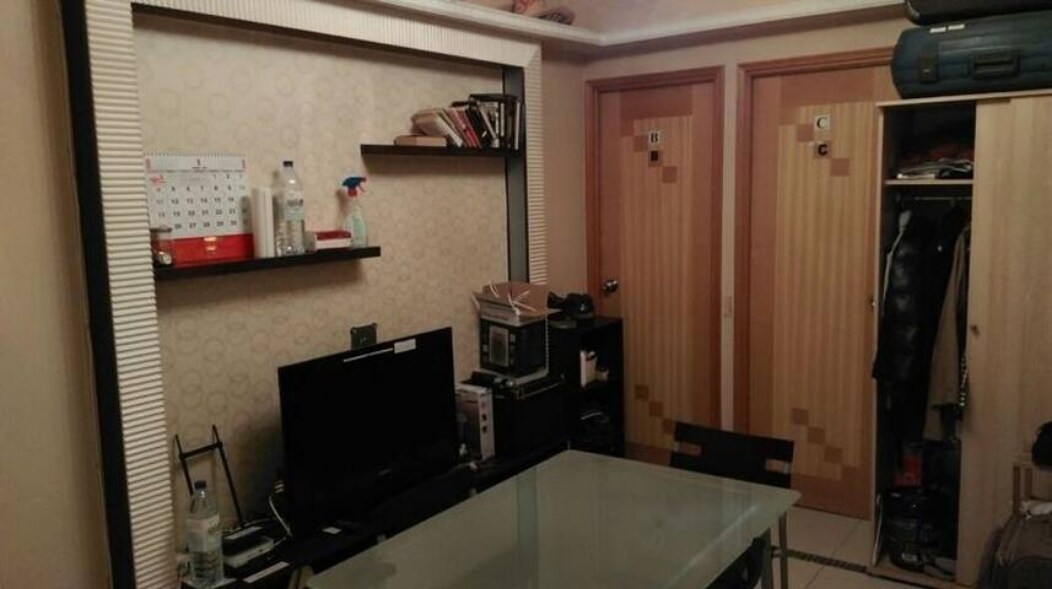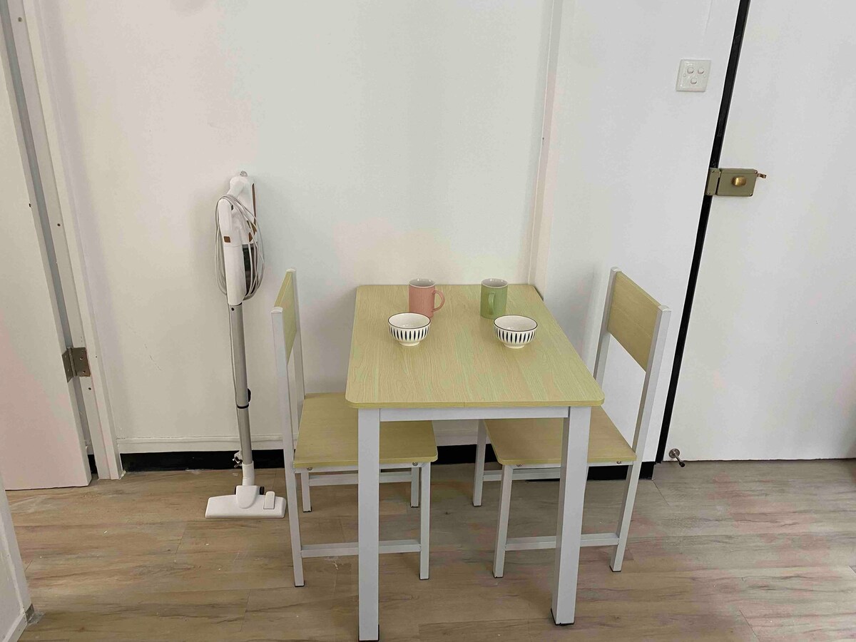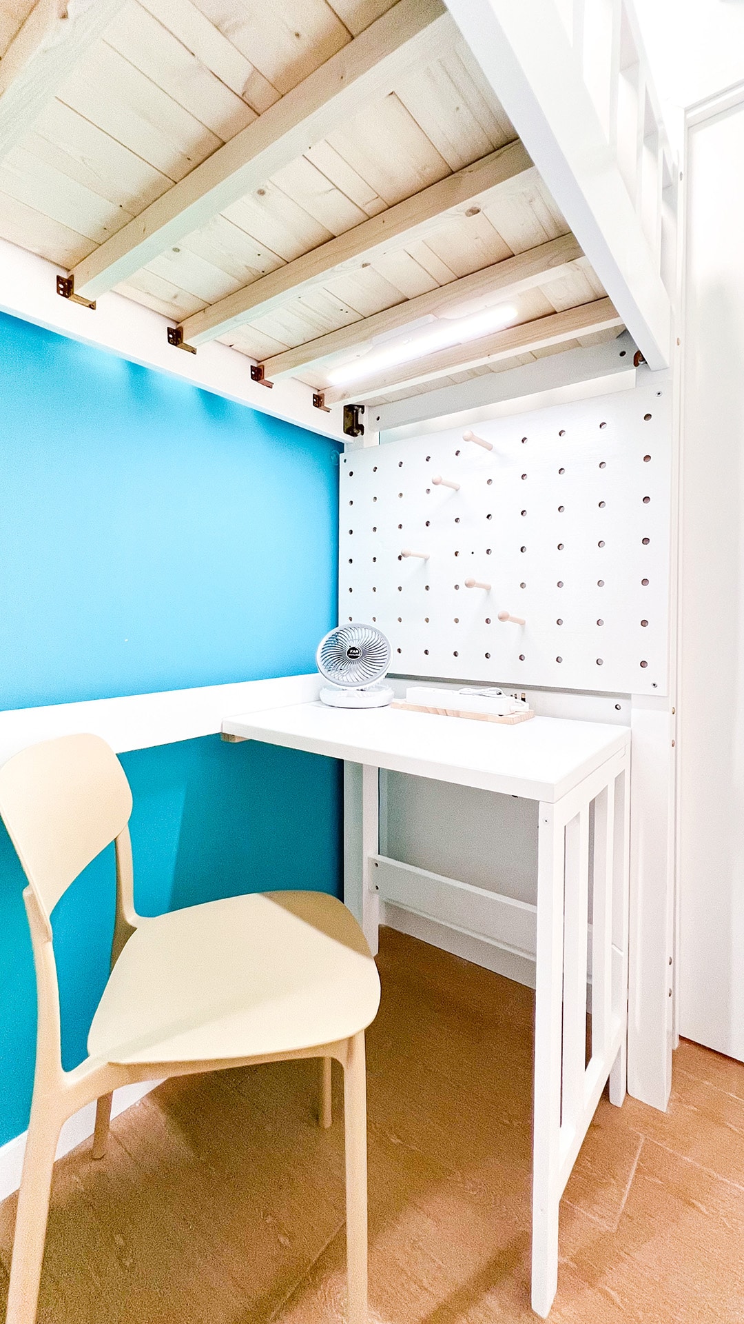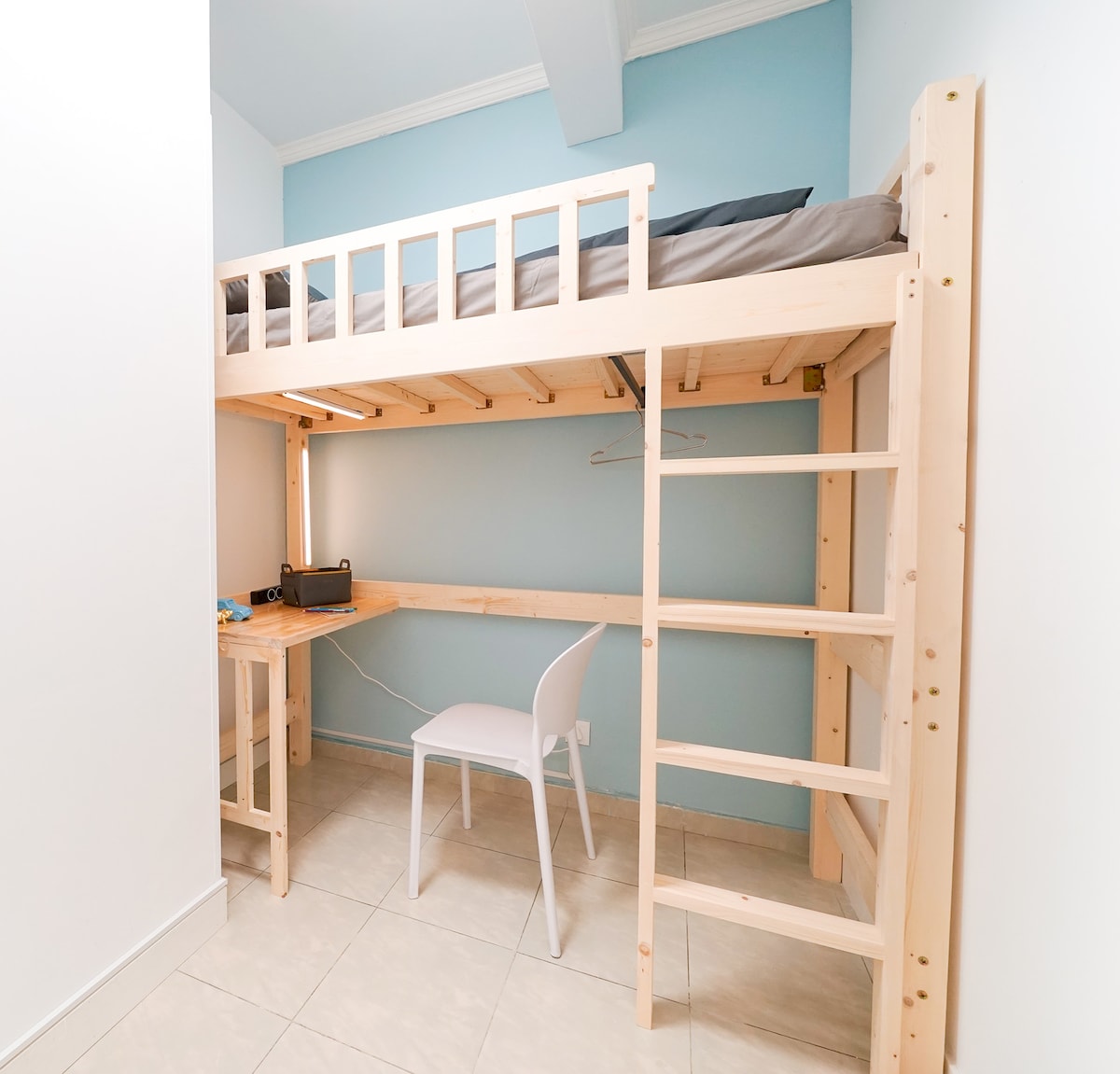 This is our shared dormitory, Cozy Out-Fitted private room you are looking at is a single bunk bedroom without window! This room equipped with a single high bunk bed 80cm x 183cm & a desk, a cloth hanger! Note: This is a no window room equipped with ventilation fan and sharing the AC from the living room! Please note this before booking ^^!