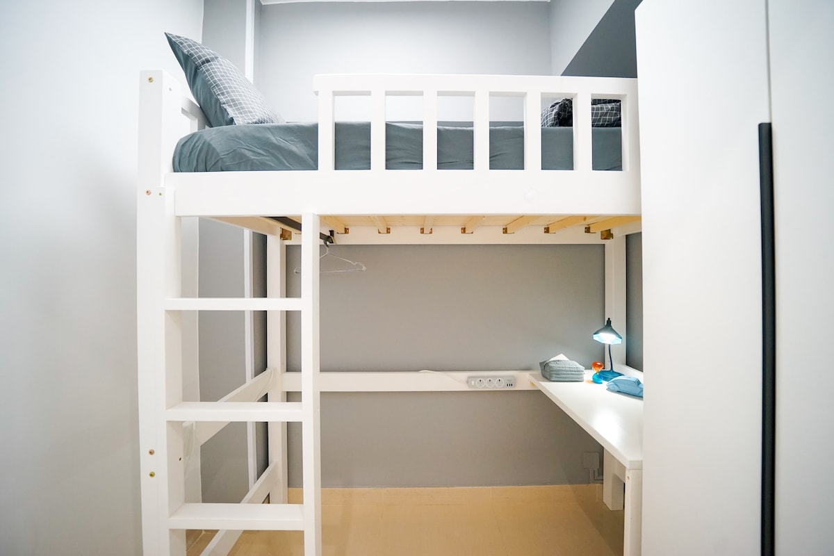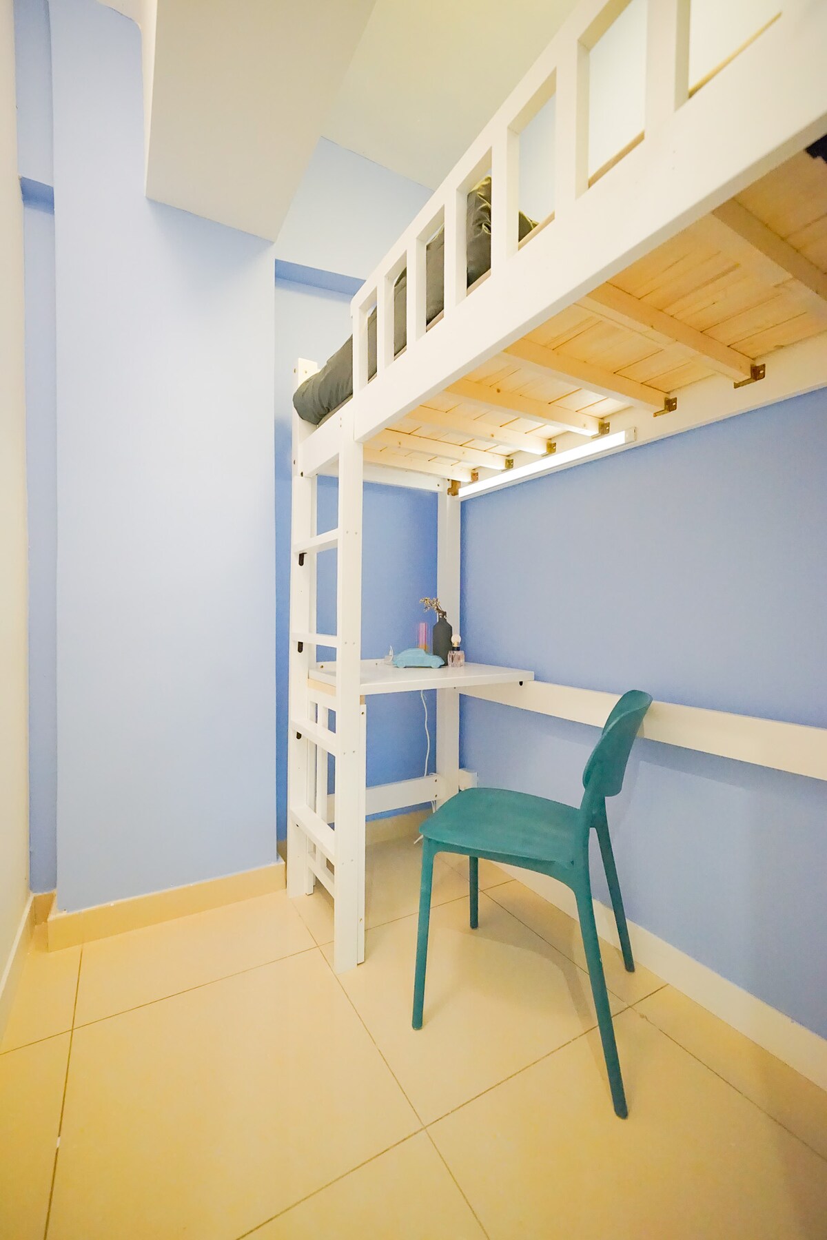 This is our shared dormitory, Cozy Out-Fitted private room you are looking at is a single bunk bedroom without window! This room equipped with a single high bunk bed 80cm x 183cm & a desk, a cloth hanger! Note: This is a mini window room with sunshine, but we do not install Air Conditioning! Please note this before booking ^^!