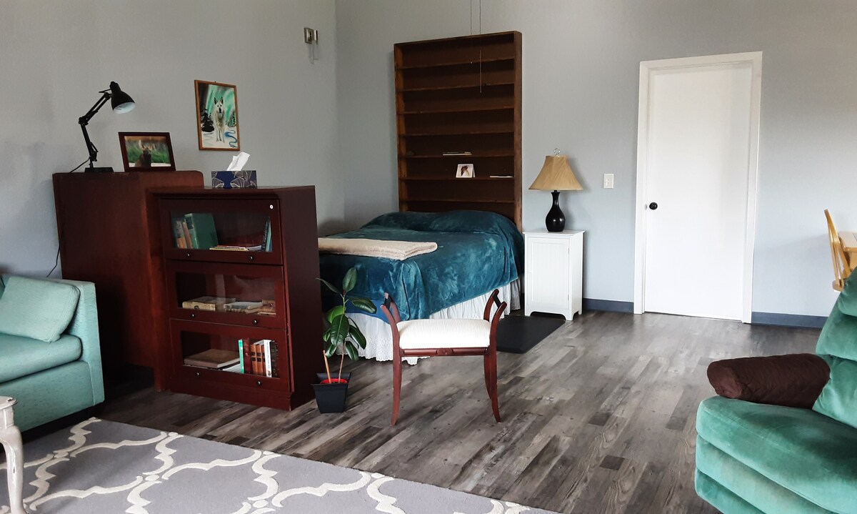 A Studio, FULLY FURNISHED & Equipped ROOM w/Very quiet and relaxing ambient, Private Single Glass Entry/Exit Door to wooden walkway & deck, Mini-Fridge, hot plate, Microwave, 3/4 Bathroom w/ Full-sized Vanity & sink, membership in Planet Fitness included (if you join, we’ll pay your $10/month fee… as long as you’re our Guest! lol )