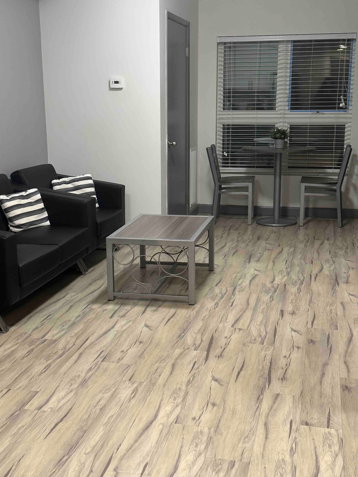 You can expect a stylish and cozy atmosphere with dark wood floors and white walls.
