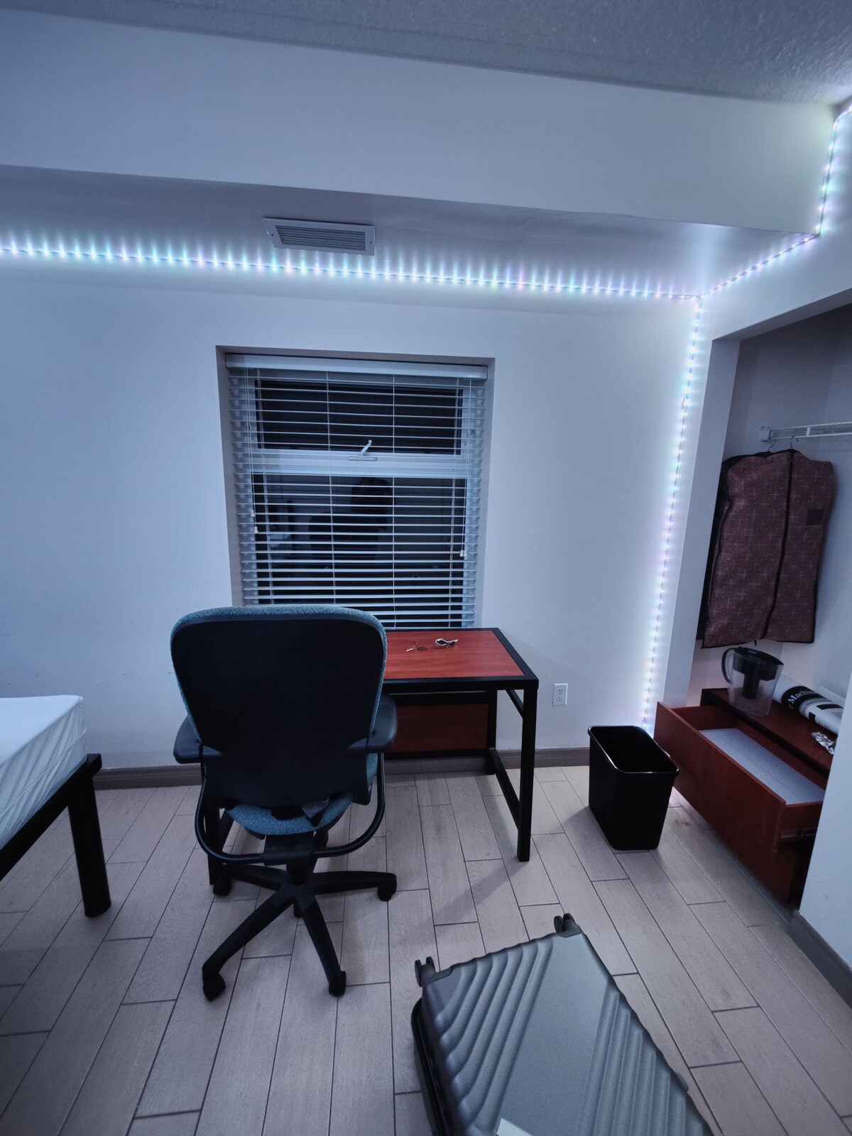 The bedroom features a work desk with a comfortable chair available with Monitor and HDMI cable. it also features a coil mattress with 1" foam