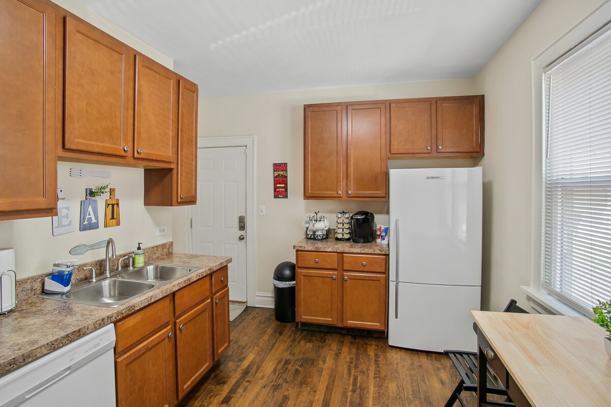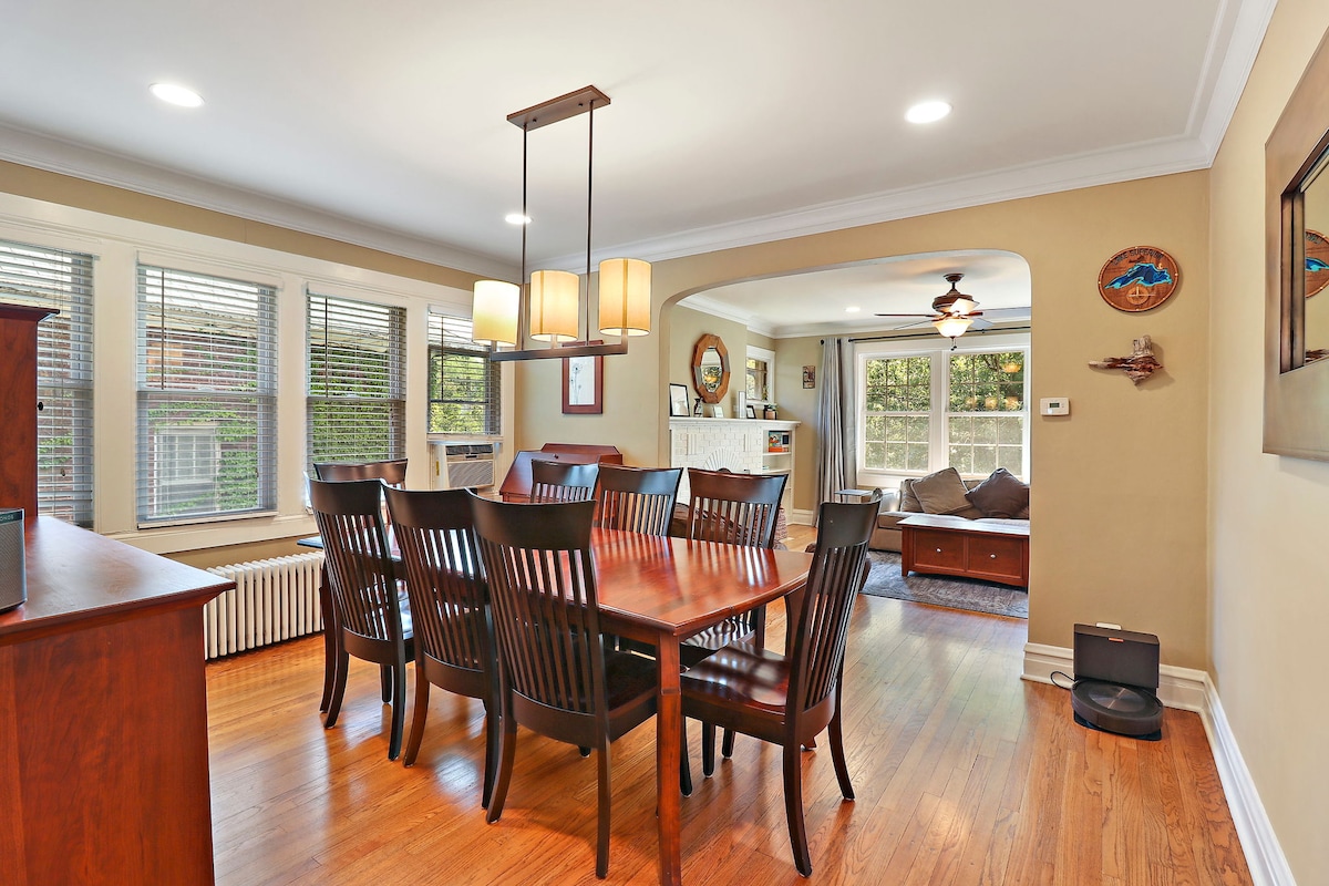 Adjacent to the kitchen is a spacious dining room, perfect for gathering around with friends and family. The living room offers plenty of space to relax, with rich hardwood floors and an abundance of natural light, all wrapped in a setting full of charm and character.