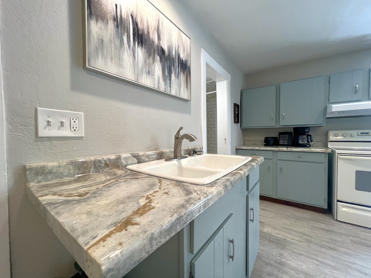 This unique place has a style of its own. It’s newly renovated and has lots of charm, yet fully functional for both short and extended stays. It has a full, eat-in “kitchenette” including a dishwasher, a clothes washer/dryer in the unit, good size bathroom and private bedroom w/ a FULL size bed. This apartment is located in a historic building near downtown area and it has a private entrance with its own patio. It has a huge front yard with fire pit, a picnic table and free parking areas.