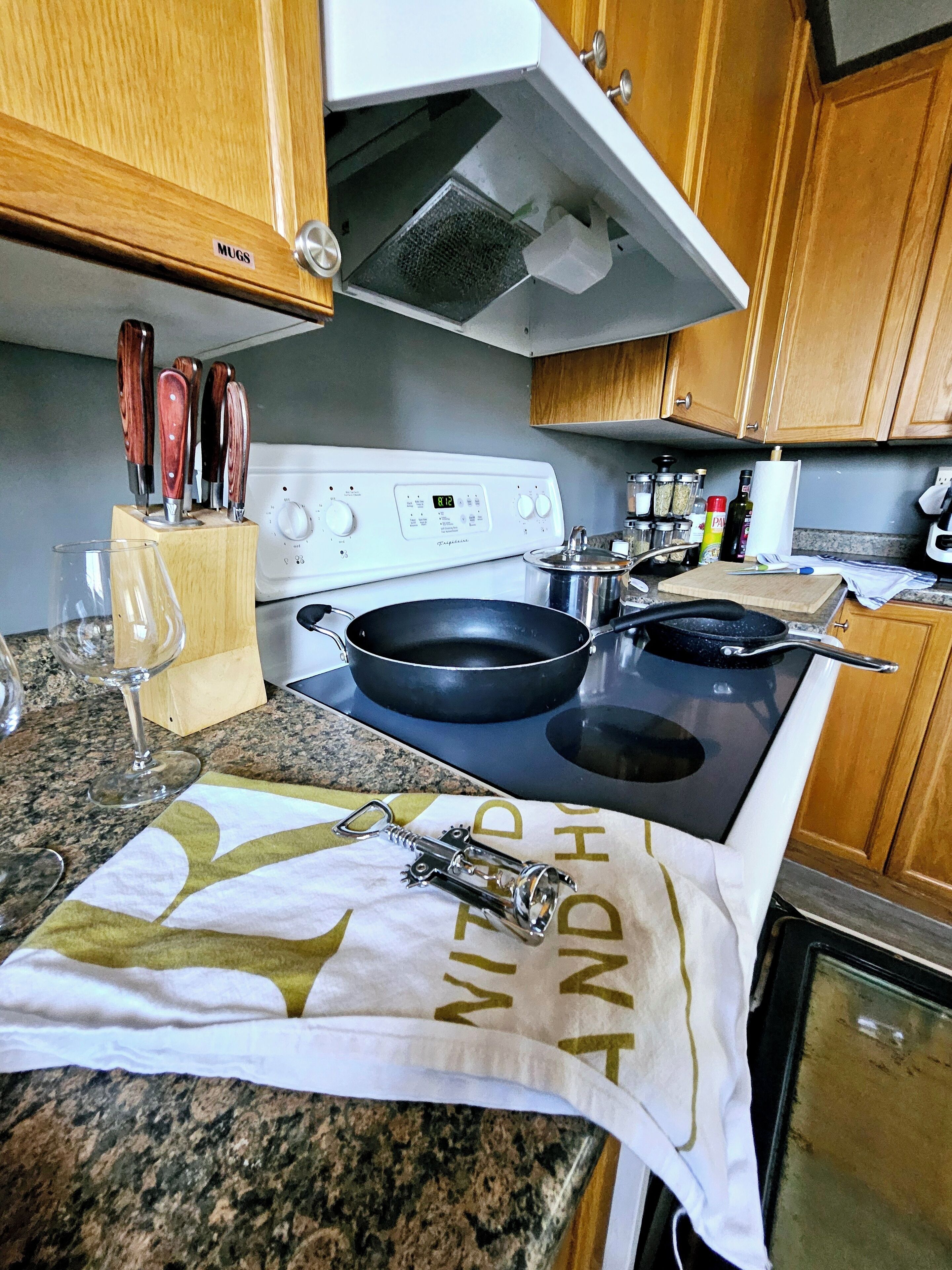 * Kitchenette: spacious kitchenette has plenty of counter space, 2 burner stove, steam convection mini oven and microwave ( Instructions for the stove and oven located near item), the Rock griddle, coffee maker, kettle, bar fridge, smoothie maker, Sodastream, complimentary coffee and tea