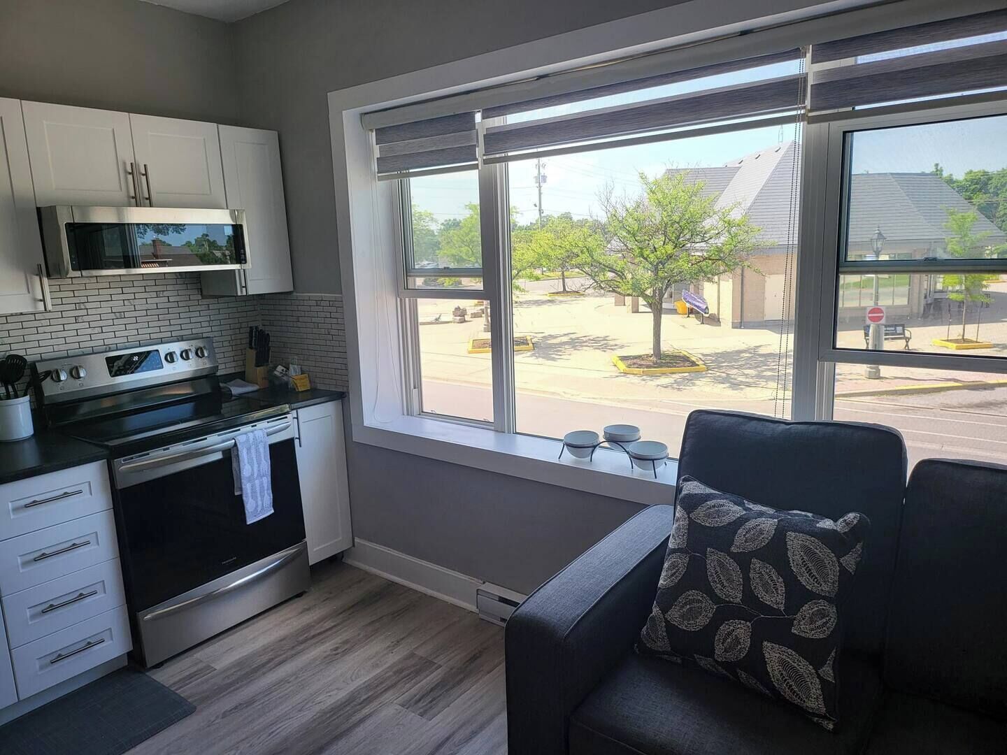 Your SuiteStay is luxuriously fully furnished and includes a gorgeous fully equipped kitchen complete with apartment size stainless steel fridge, a plug in induction cook top and large microwave. The kitchen also comes with a toaster, Keurig coffee maker and all kitchen supplies, including dishes, pots, pans, utensils and cutlery, etc. everything you need to cook a great meal for your friends and family.