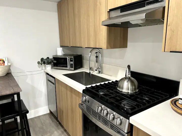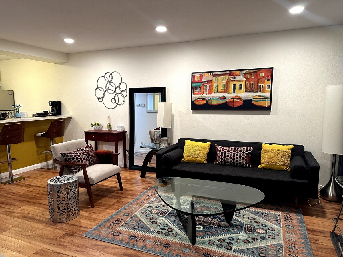 As soon as you open the door to this 2bed/1bath, you'll find the living space features a comfortable seating area, a 65 inch smart TV (no cable), AC unit in each room, and a desk area perfect for a workspace. The kitchen includes everything you need to cook at home and a dining area for enjoying a meal.
