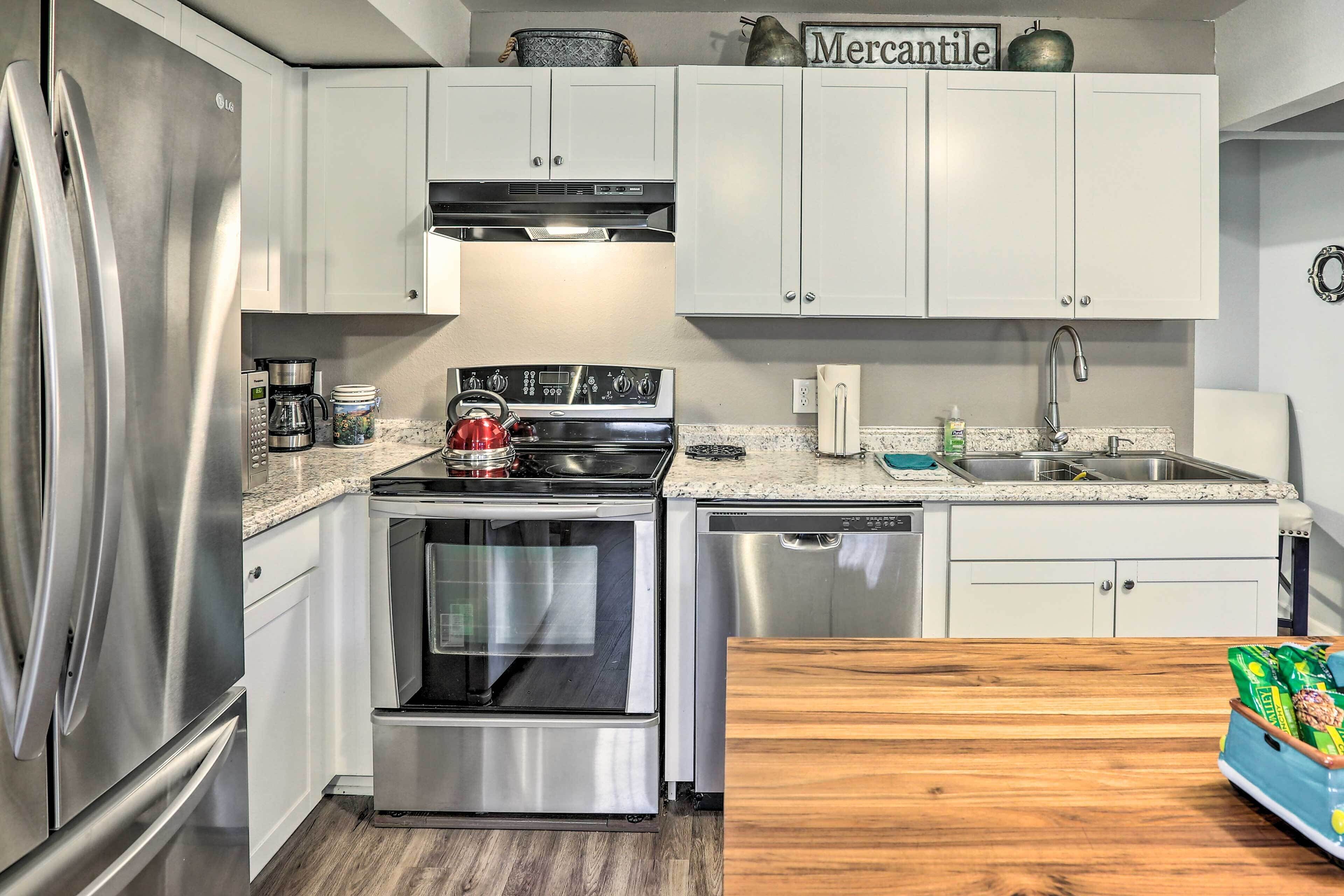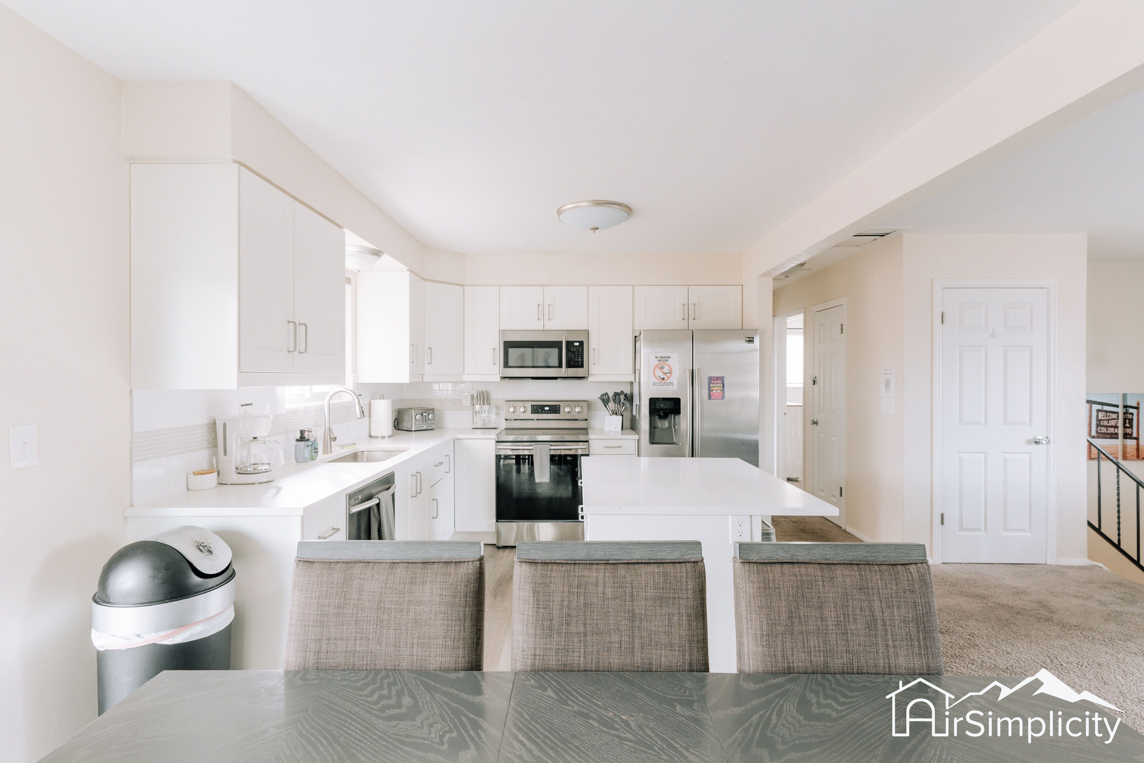 Kitchen & Laundry: The fully stocked kitchen makes cooking easy, featuring a full-sized oven/range, microwave, refrigerator, and dishwasher. We provide all the plates, cookware, and a Keurig (with coffee/creamer!) to get your mornings started. A combination washer/dryer is tucked right next to the fridge, complete with complimentary detergent.