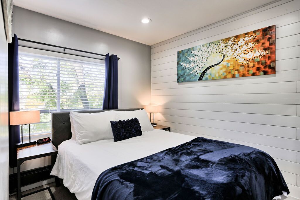 The home’s three bedrooms offer restful, private spaces equipped with blackout curtains and memory foam mattresses for deep, uninterrupted sleep. The upstairs primary suite features a king-sized bed, boho chair, massage recliner, and large TV - ideal for decompressing in solitude. A second upstairs bedroom includes a queen bed, stylish furnishings, and generous storage. Downstairs, the third bedroom provides another queen bed with all the essentials for comfort.