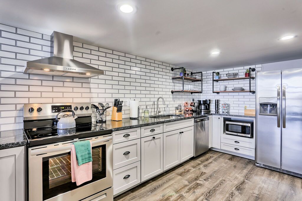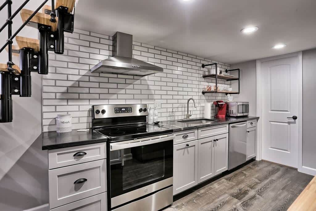 Bathroom: Just past the laundry area is the beautifully renovated bathroom, featuring clean white countertops and a tiled stand-up shower. It’s fully stocked with shampoo, conditioner, and body wash for a hassle-free stay.