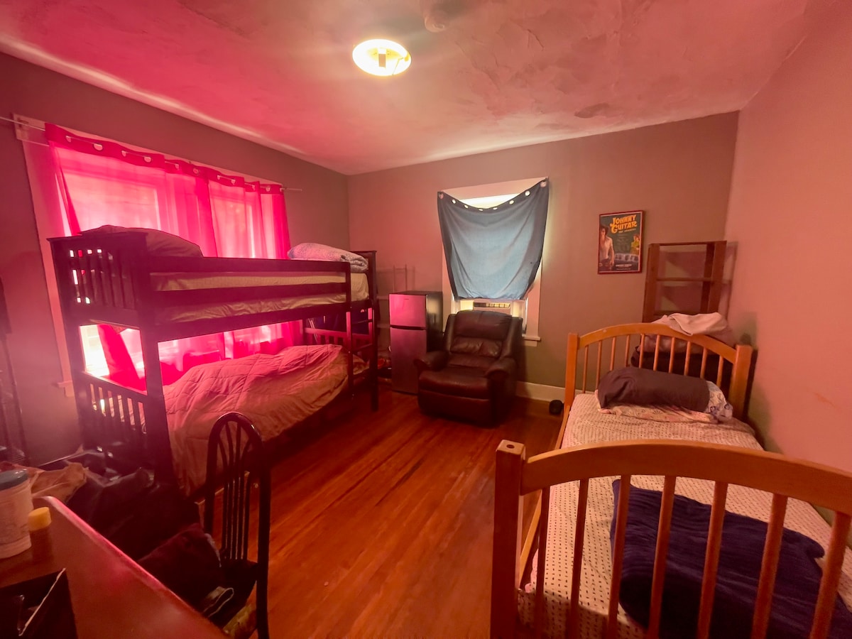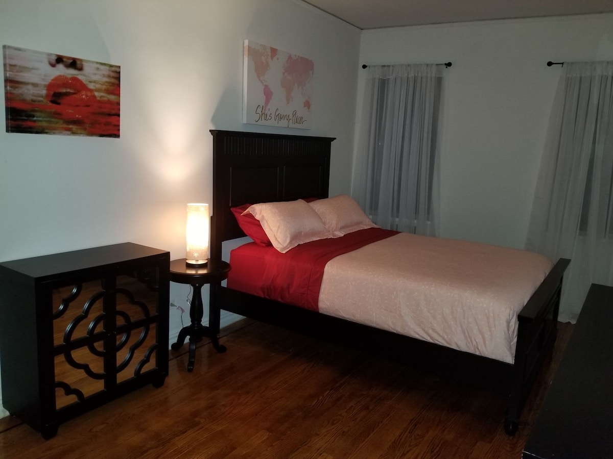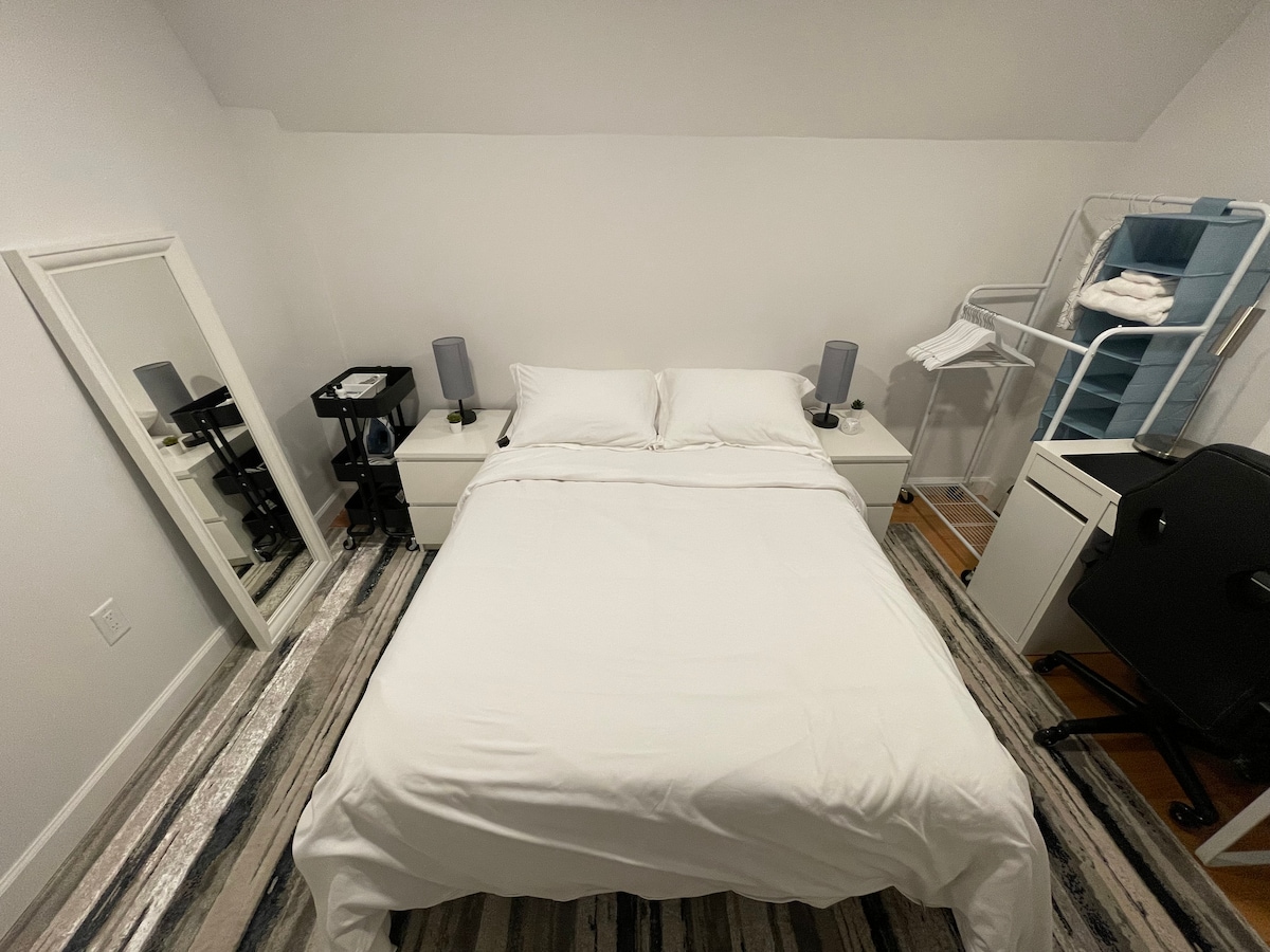 This bedroom is equipped with a full size bed, office desk/chair, mini fridge, closet space, wifi, smart 45" tv, cable tv, deadbolt lock, toiletries, and is walking distance to many restaurants, train station and so much more.