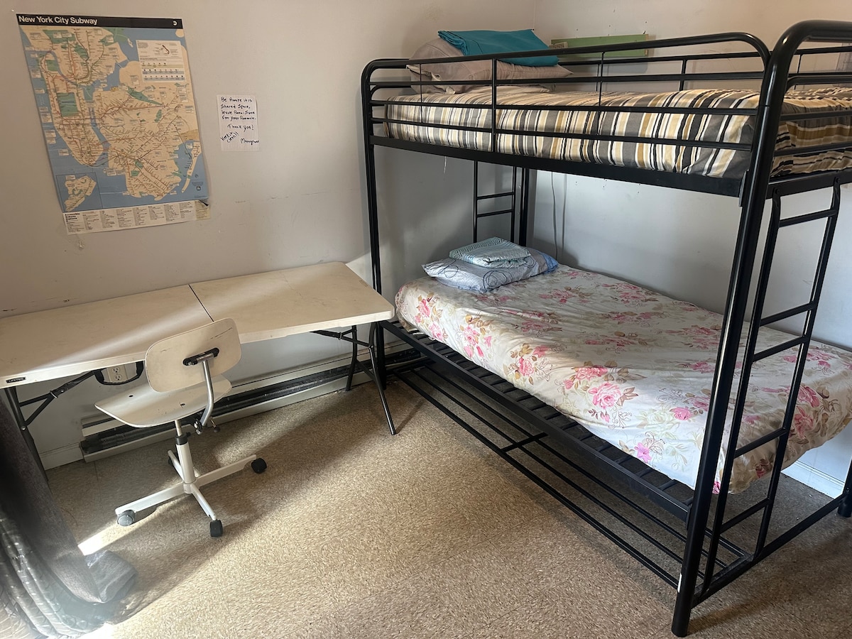 This is a furnished room (8 x 8), one window to the kitchen. The living room, the kitchen and bathroom are shared. Limited kitchen access.