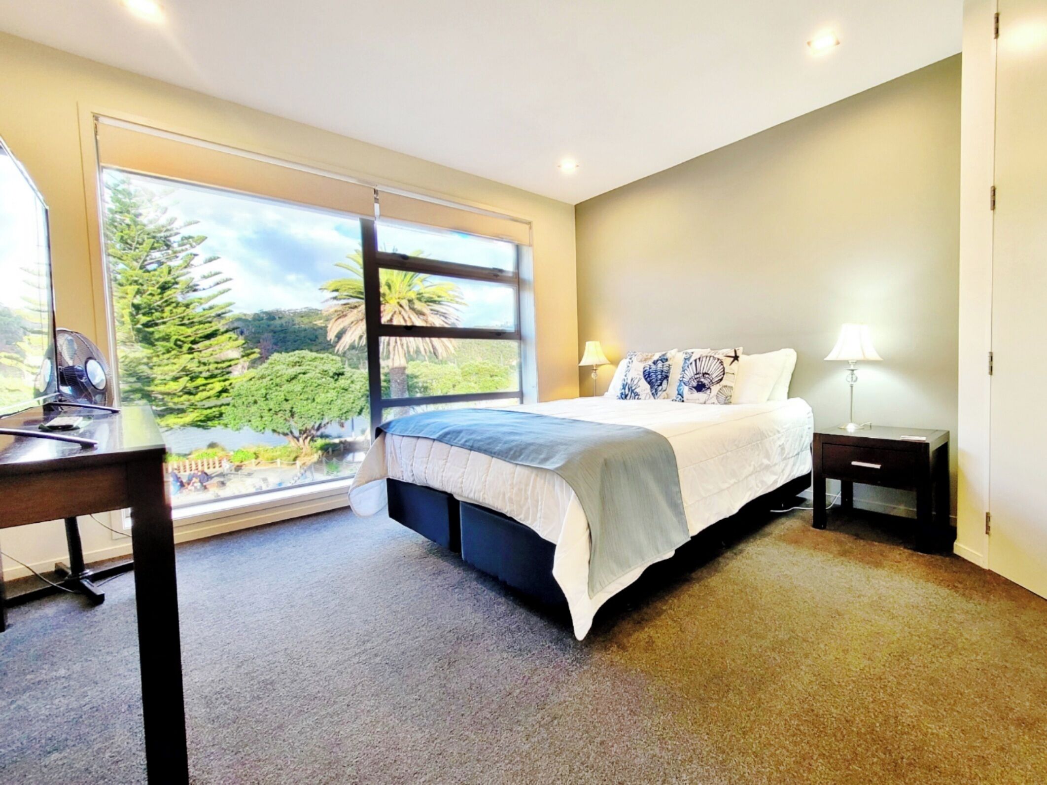 Villa 30 at Aqua Soleil, Whitianga is two storied and self contained with all towels and linen provided. Upstairs accommodates 5 guests in 2 bedrooms. The Master bedroom with a king bed has a ranch slider opening onto its own decking and the second bedroom has a queen bed and a single bed. The main bathroom with cubicle shower, toilet and vanity is upstairs also.