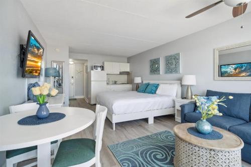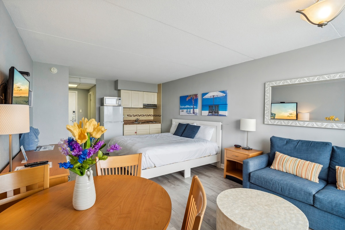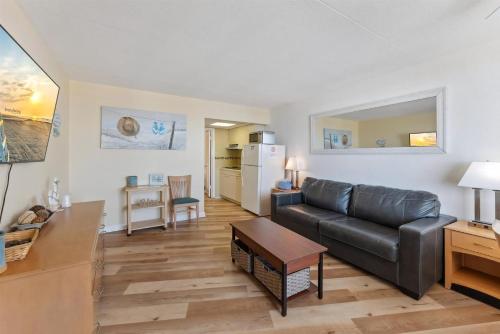 Unit 512 at The Nassau Inn is an oceanfront studio for up to four guests, featuring a king bed, queen sleeper sofa, and a private balcony. The kitchenette includes a refrigerator/freezer, stovetop, microwave, and Keurig. Enjoy Smart TVs, Wi-Fi, a heated pool, sun deck, BBQ grills, and on-site parking. Additional amenities include a smart lock, outdoor shower, elevator access, bicycle rack, and laundry facilities. Linens and fresh towels are provided for a comfortable stay.