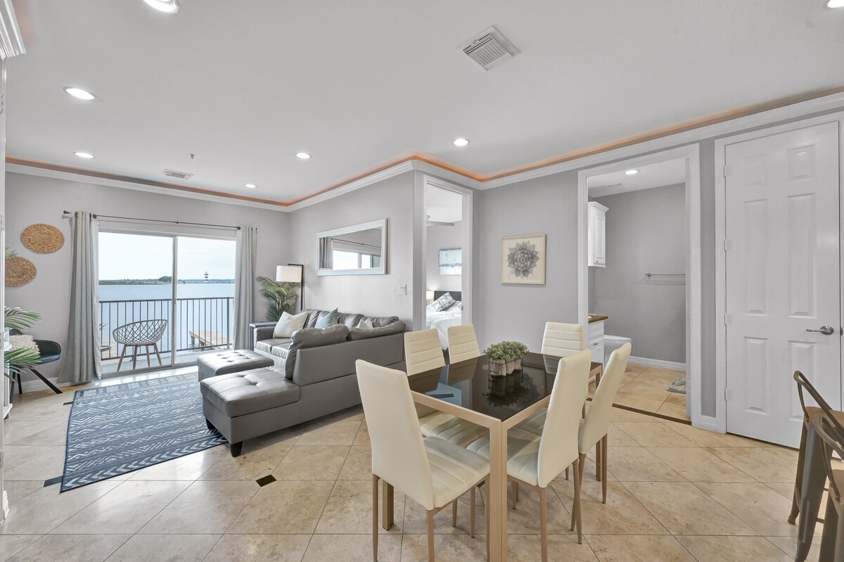 Kitchen eat in living room offers plenty of space to sit and relax with lake views. Please make any request so we know how to accommodate you !