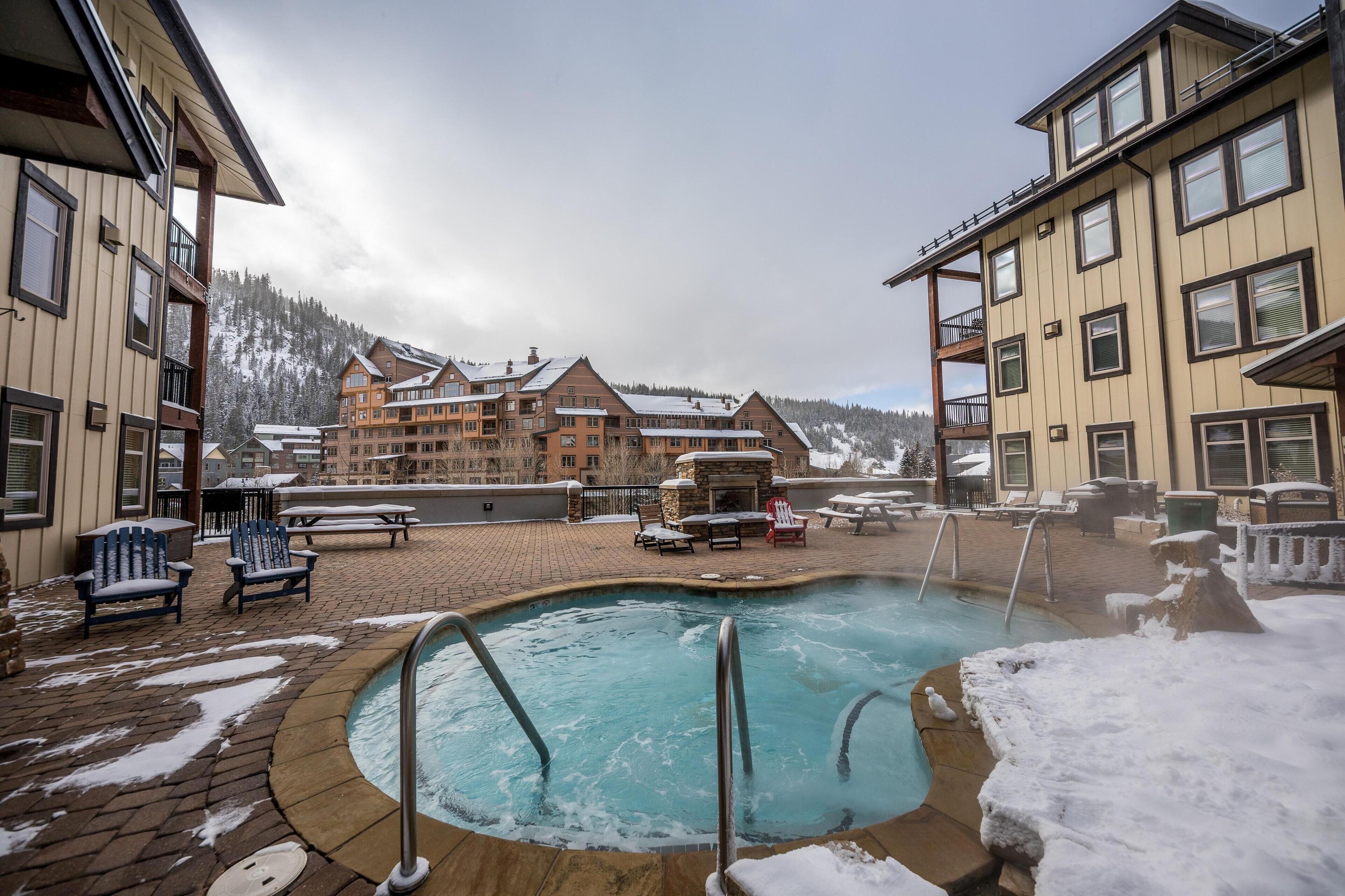 The best place to be in Winter Park is this truly ski-in ski-out condo right on the corridor trail from Mary Jane to the gondola. Peaceful, treed mountain views out the window and luxury shared amenities: two 17-person hot tubs, heated pool, gas fire pit, full exercise room, game room, and steam room.