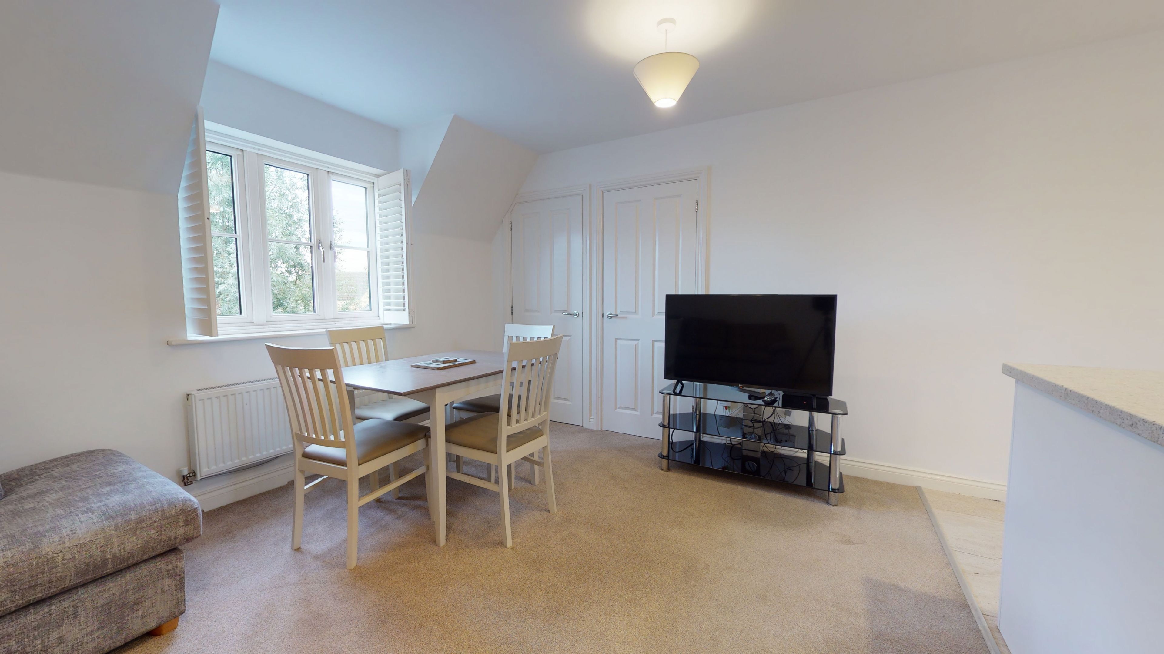 The Lounge area is well equipped with a smart television and feature electric heater, feature windows look out over the village green