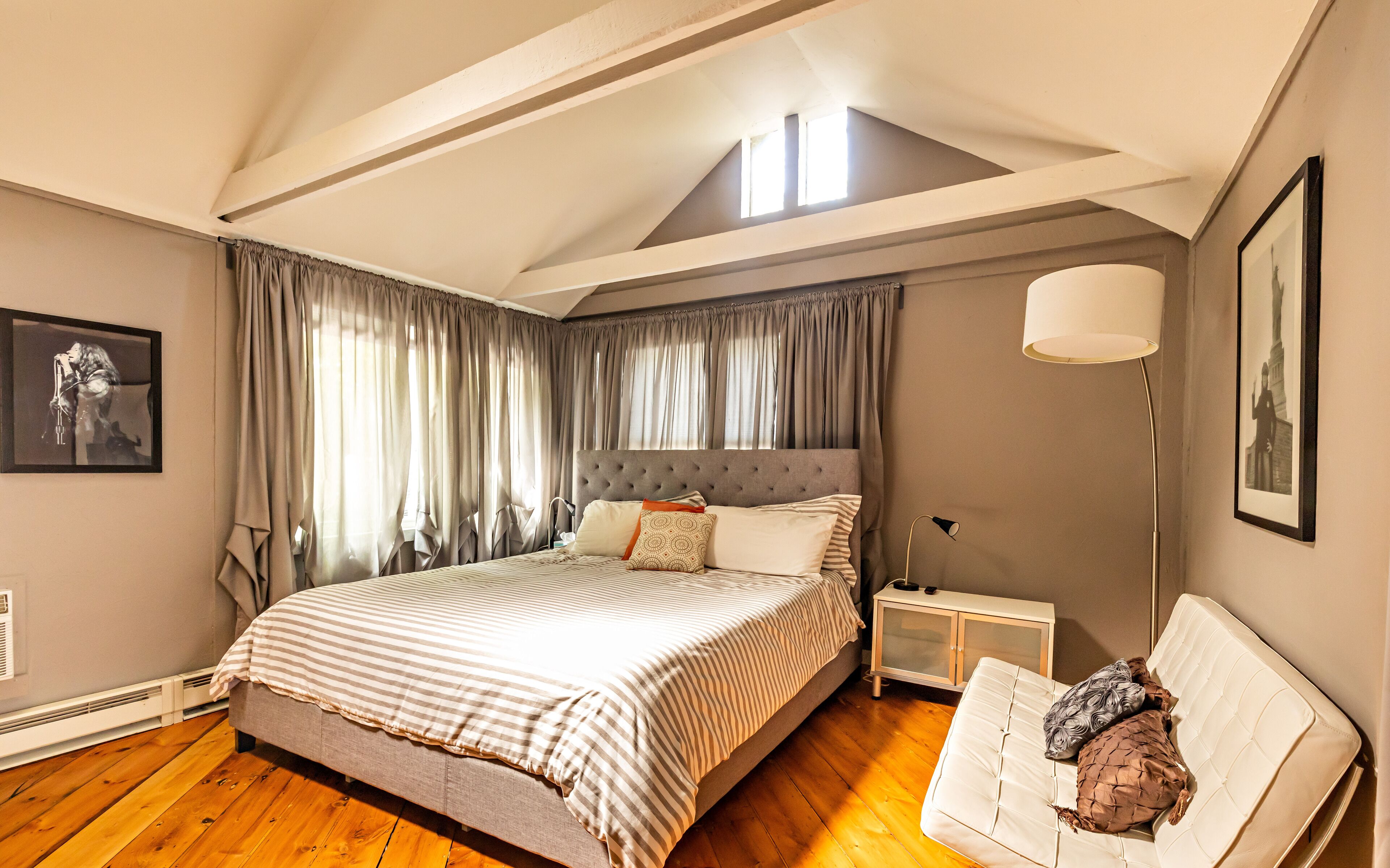 Take advantage of all that Woodstock has to offer. Just steps to best restaurants, galleries, pubs, yoga, theatre and shops. Calm and comfortable, decorated in hues of white, black and grey with vibrant pops of color. Reclaimed pine floors throughout this 2 bedroom with an inviting open plan concept. The living area has a fun electric fireplace, flat screenTV, paintings, objects d'art - all combined with a bohemian, modern elegance - reminiscent of Woodstock's rich culture and history.