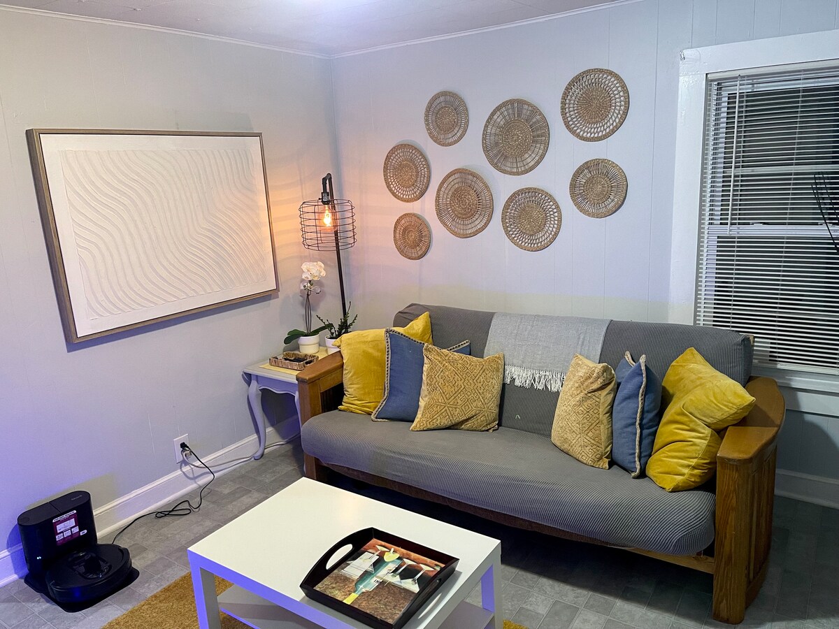 Living room - Large living room with a couch that comfortably seats 3 guests with a coffee table and a large HD tv with amazon prime video.