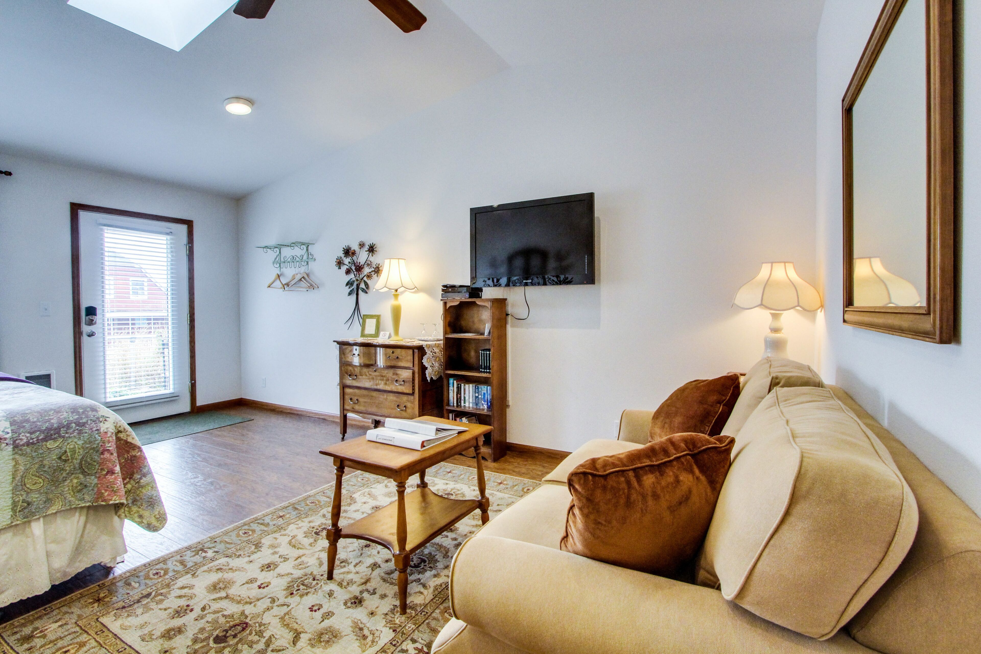 Cheerfully decorated in a palette of soft blues, tans and whites, the interior features a queen-sized bed, love seat, rocking chair, coffee table, dresser and desk with a chair. Comfortably designed to accommodate two guests, this unit also features wireless Internet, cable, a mini-refrigerator and microwave. Dogs are also allowed for an additional nightly fee.