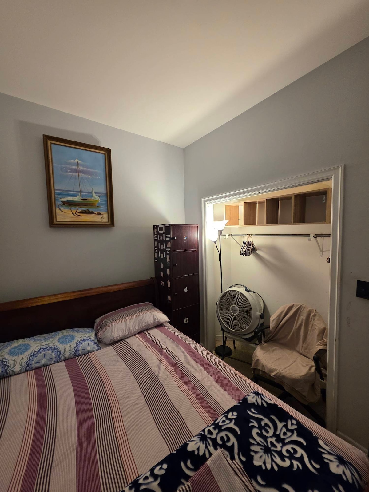 The bedroom also has ample space, with two closets and a dresser. There is a desk with a comfortable chair, and the room is well illuminated. There is a comfortable queen-sized bed, with pillows stuffed with soft feathers, and overall has excellent decorations.
