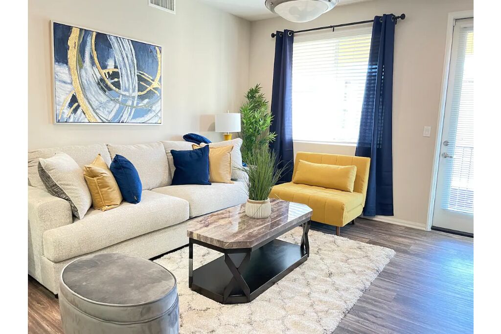 Spacious 2BR 2BA with pool and fitness center amenities close drive to Disney, Pond and universities. WIFI, Fully Equipped Kitchen, dedicated parking, Work Desk, ROKU TVs in every room, In unit washer/dryer