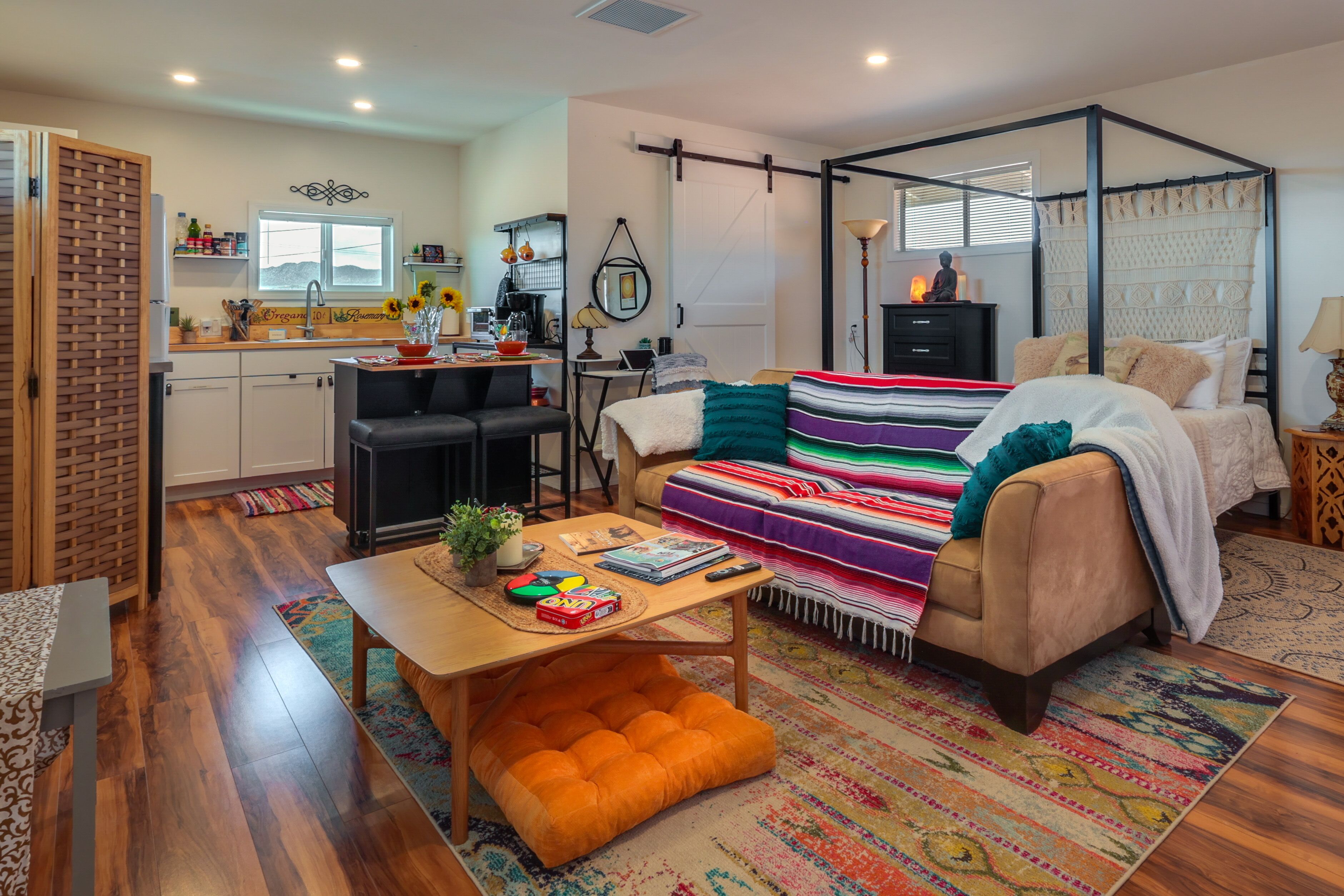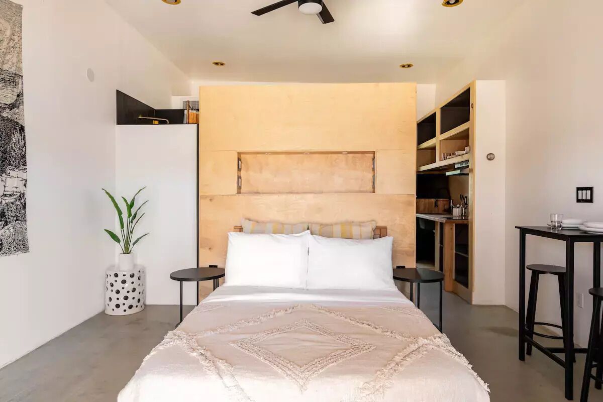 This charming studio features a fresh take on the desert industrial motif with ifs concrete floors, clean lines, open shelving in the kitchen along with butcher countertops, and sleek glass induction cooktop. The open air bathroom is the show stopper of this studio with its walk-in shower, brushed gold fixtures, black vessel sink and a freestanding tub you could spend hours in. It is also quipped with a full line of spa like products to nourish your skin after the day's adventure in the ever changing climate of the desert. The bedroom area features a pass-through window that allows the room to feel open and airy and a large utility closet.