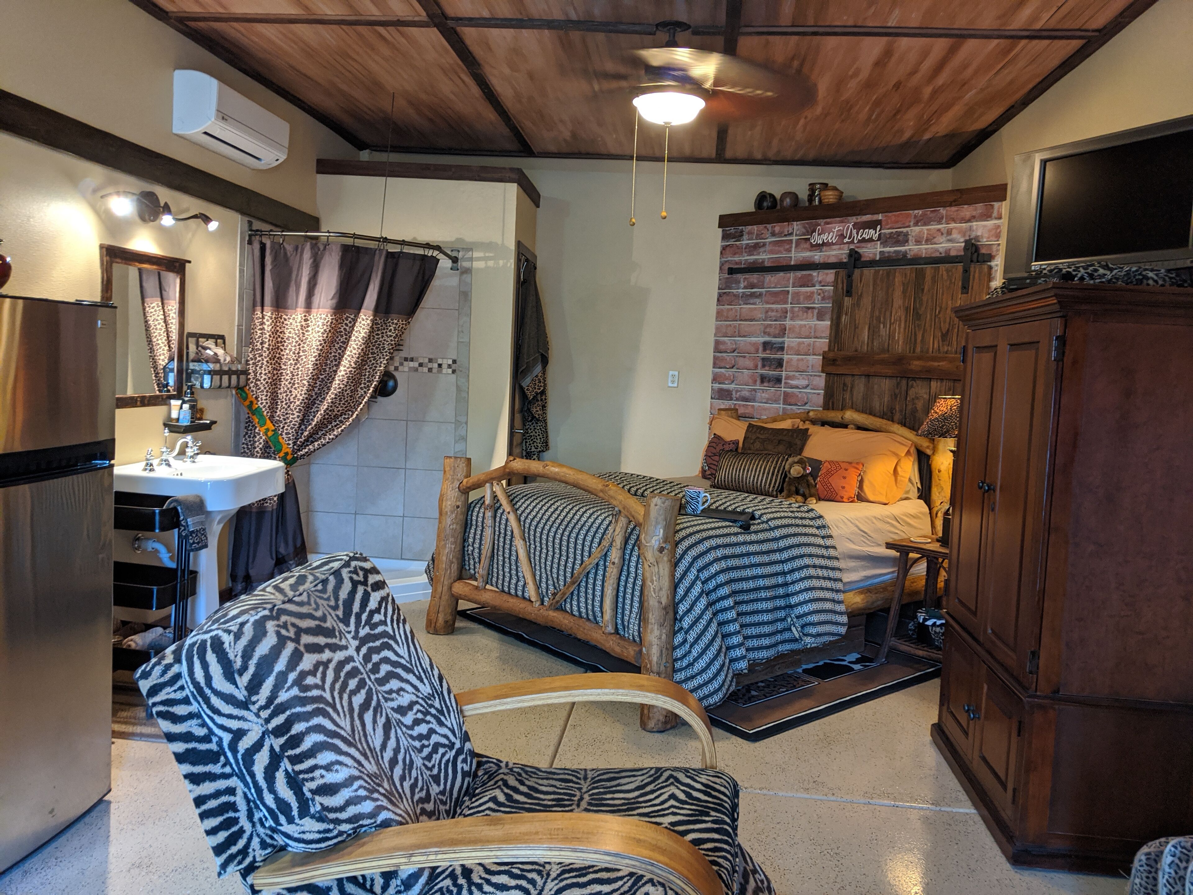With this casita, you are greeted with a comfortable bed and plenty of room for your belongings. The home is equipped with a full bathroom with a tub and a washing machine.