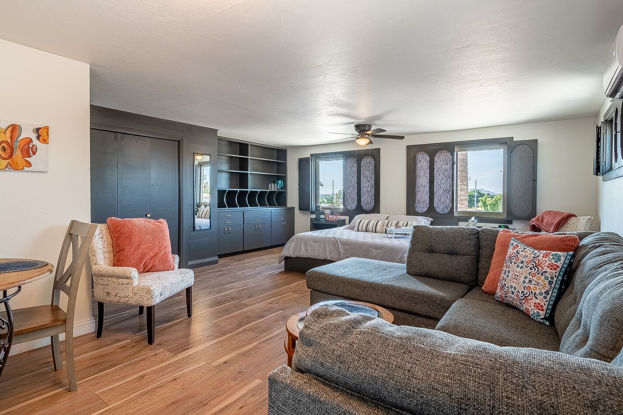The space is thoughtfully updated with convenience and comfort in mind. Each room, including the kitchen and bathroom, has its own minisplit for individualized heating and cooling. The bedroom has a queen-size Murphy bed, and the living room offers a full-size Murphy bed — great for extra guests or flexible use of space.