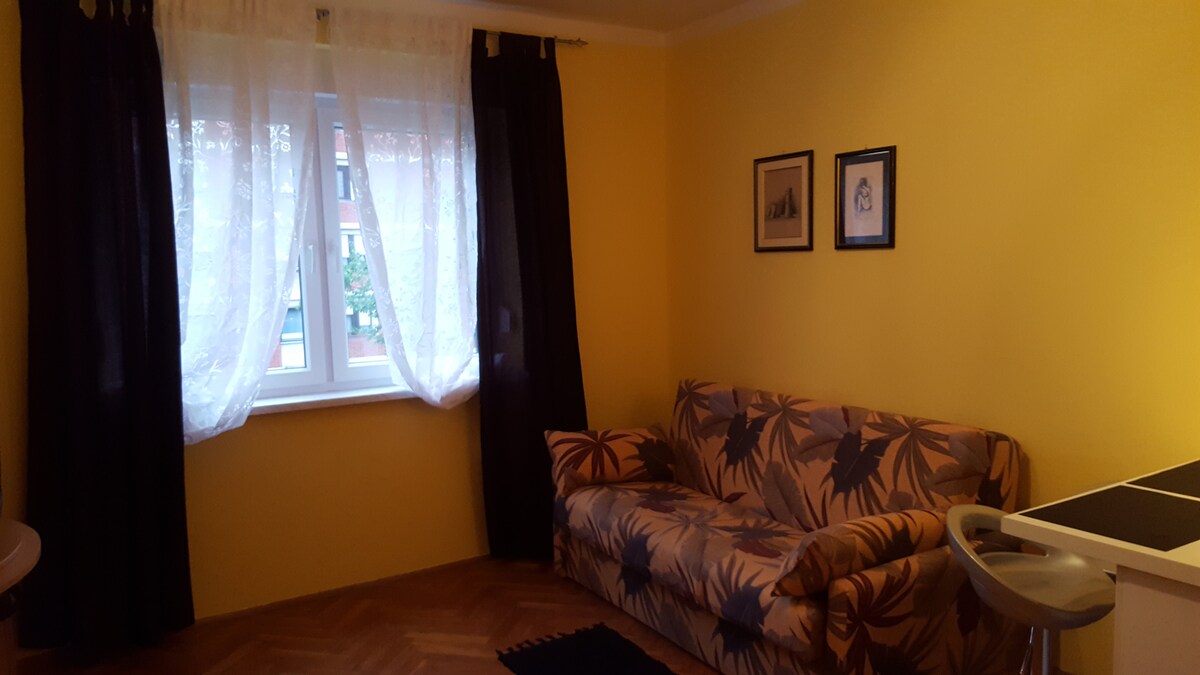 The apartment has a small bedroom and a warm and sunny living-room with a pull-out bed for an additional person to crash on after roaming through the town. The living-room opens into a fully equipped kitchen and there is a nice, newly decorated shower+toilet. The tram, main bus and train station are all within a few minutes from the apartment.