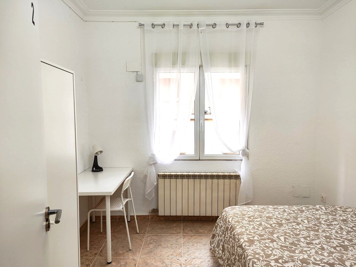 Spacious room of 10 sqm. With double bed of 135x190, Large wardrobe, Desk, Chair, Flexo, very bright and spacious Library! :) Perfect for those who love to read.