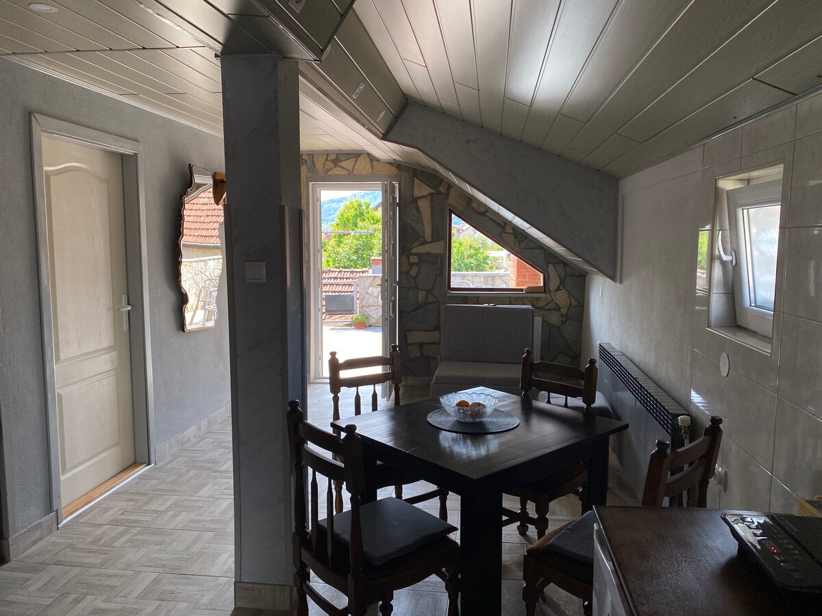 An apartment with private 2-bed room and shared kitchen, bathroom and outdoor dining area. Located in 10-minute walk from famous Drina River House, close to restaurants and shop, 10-minute walking distance from the city center.