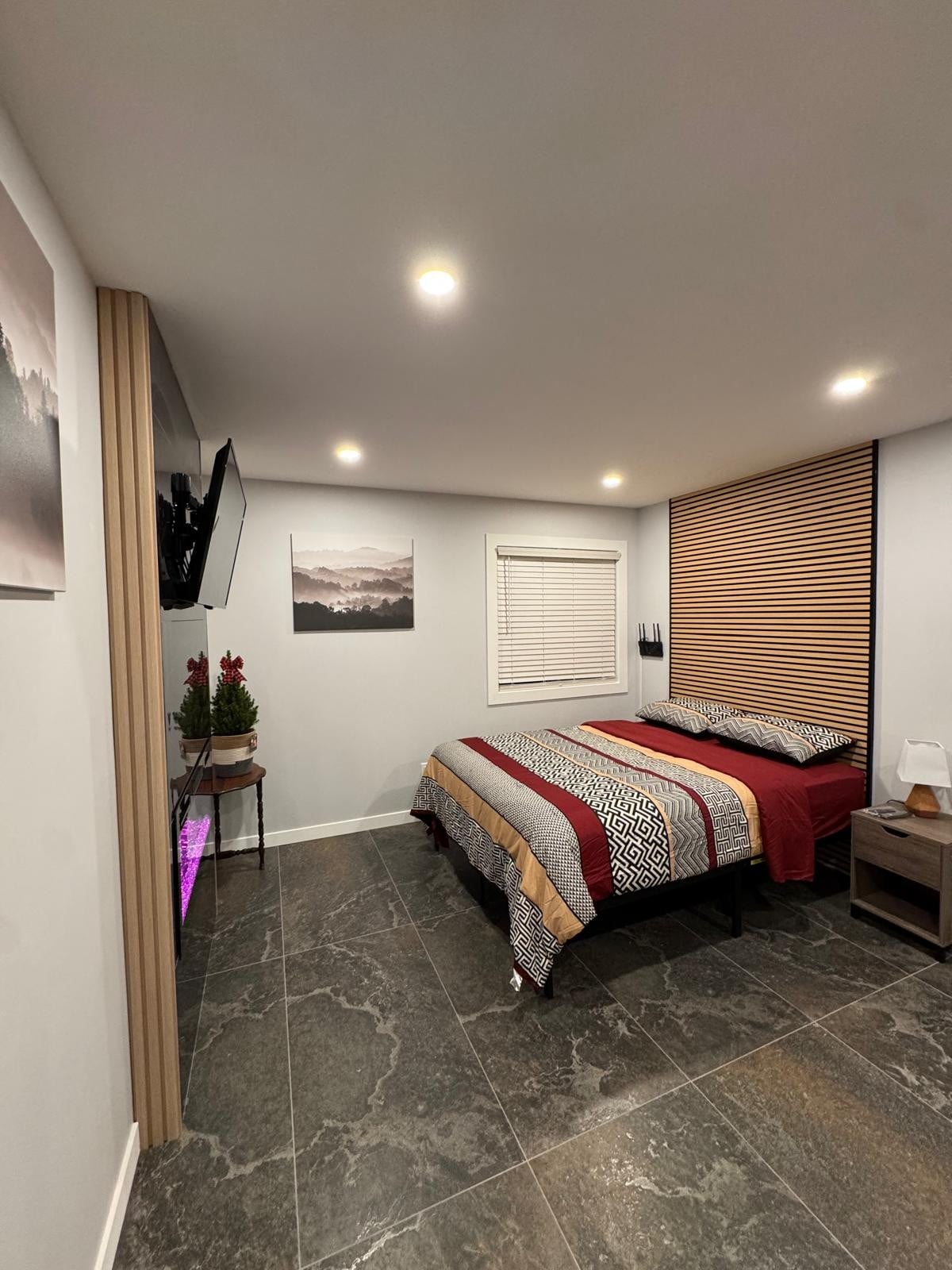 Mountain view with private access, suite built to high standards with luxury and comfort in mind. Modern large kitchen with waterfall island, heated floor, air conditioning, en-suite, walk-in-closet, plush bed, comfortable living room with a wall mounted large screen TV opening on to a private large concrete patio.