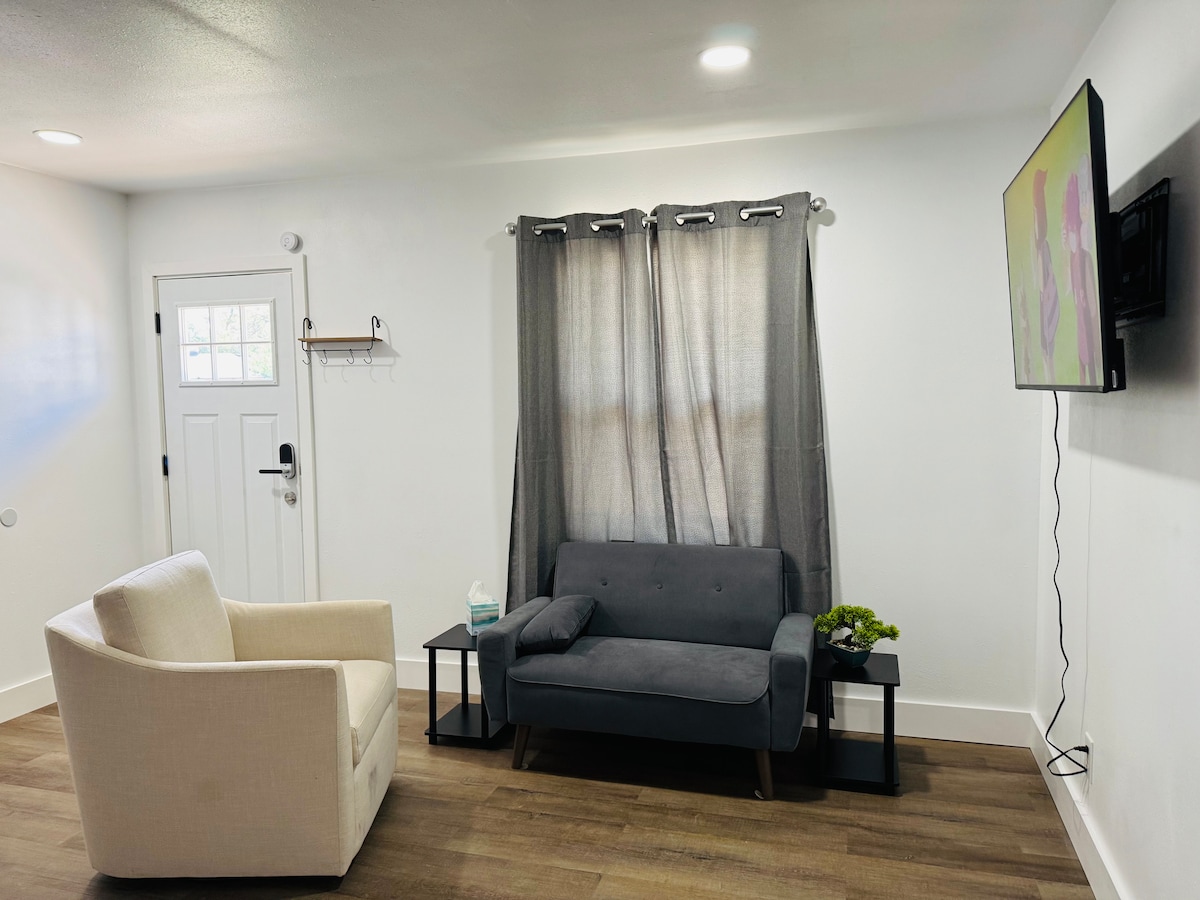 This is a small, private detached home that shares a driveway and yard with the larger home next door. Guests will enjoy a spacious bedroom, full kitchen, and a bathroom with a shower/bath combo. The bedroom is furnished with a queen-sized bed, a small sitting area, and a walk-in closet. The living room has a small couch, daybed, and a TV with Roku access. Wifi is included with stay.