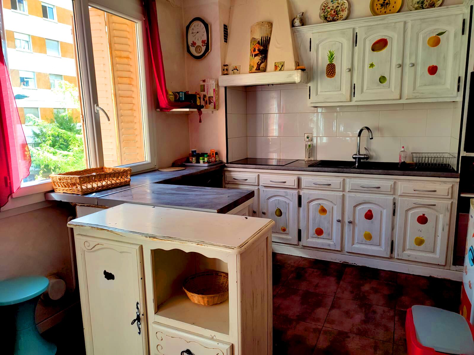The garden is fenced (40 m2) and on the same level as the kitchen and bedroom.