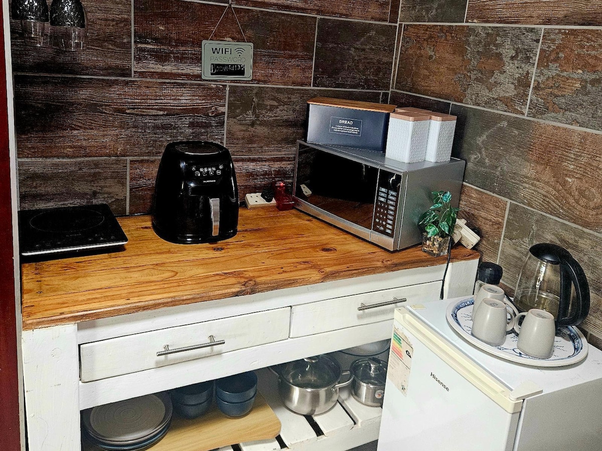 Lovely Private Room with queen size bed and on suite shower. Self-catering kitchenette with a Microwave, Kettle, Small Fridge and 1 Plate Stove. Patio overlooking the Garden and Pool