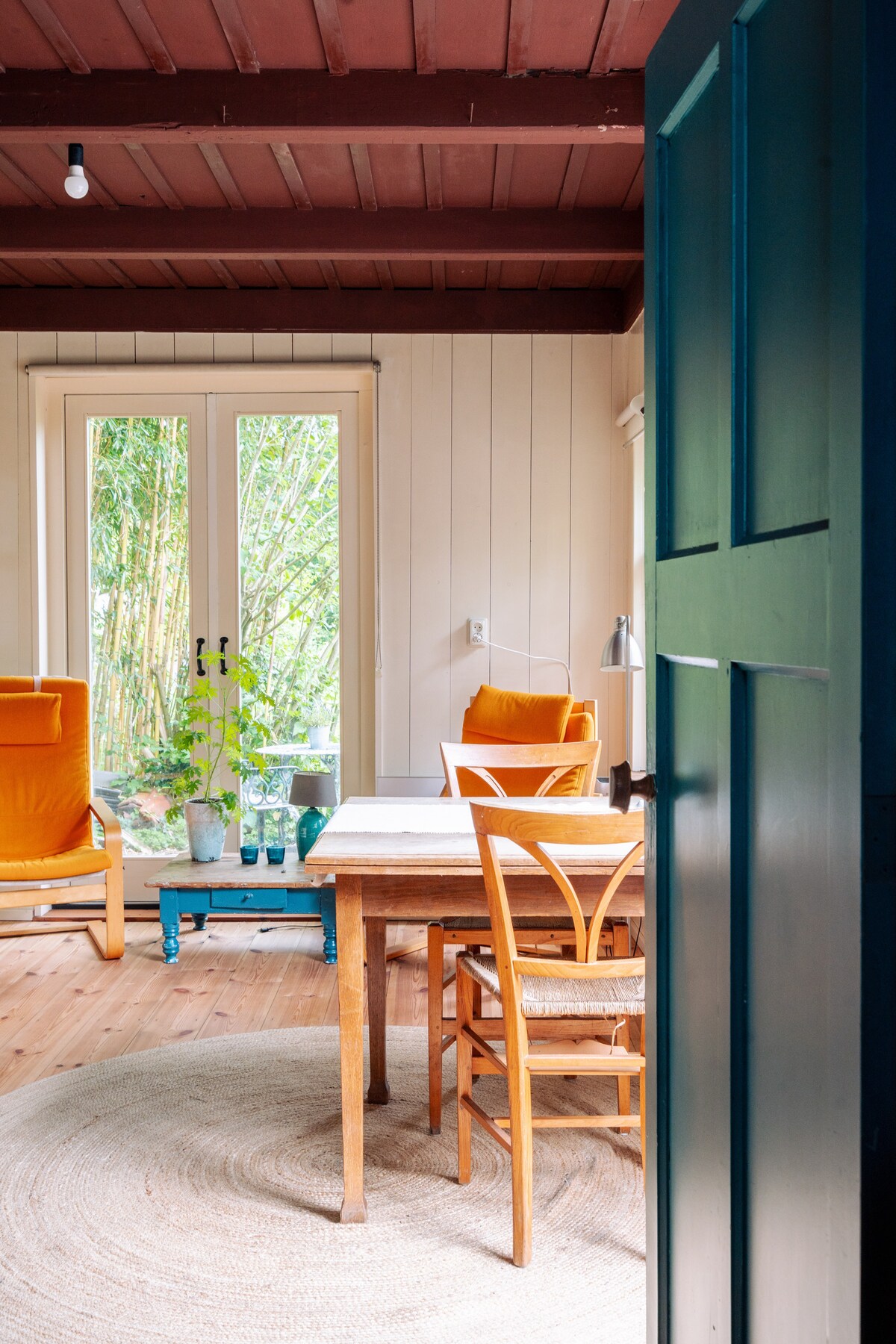Small, clean, minimalist, modern, bright. It is a Garden Room, which looks like a tiny house, but without a kitchen. There is a kettle and coffee and tea. There are games, there is a pick-up to play records and there is a quiet playground next to the house.