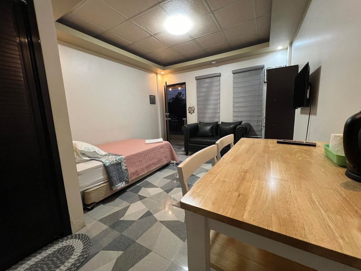 Kubo Unit is a studio style room with 1 full-double bed (54x75inches), dining table, refrigerator, electric fan, rice cooker, oven toaster.