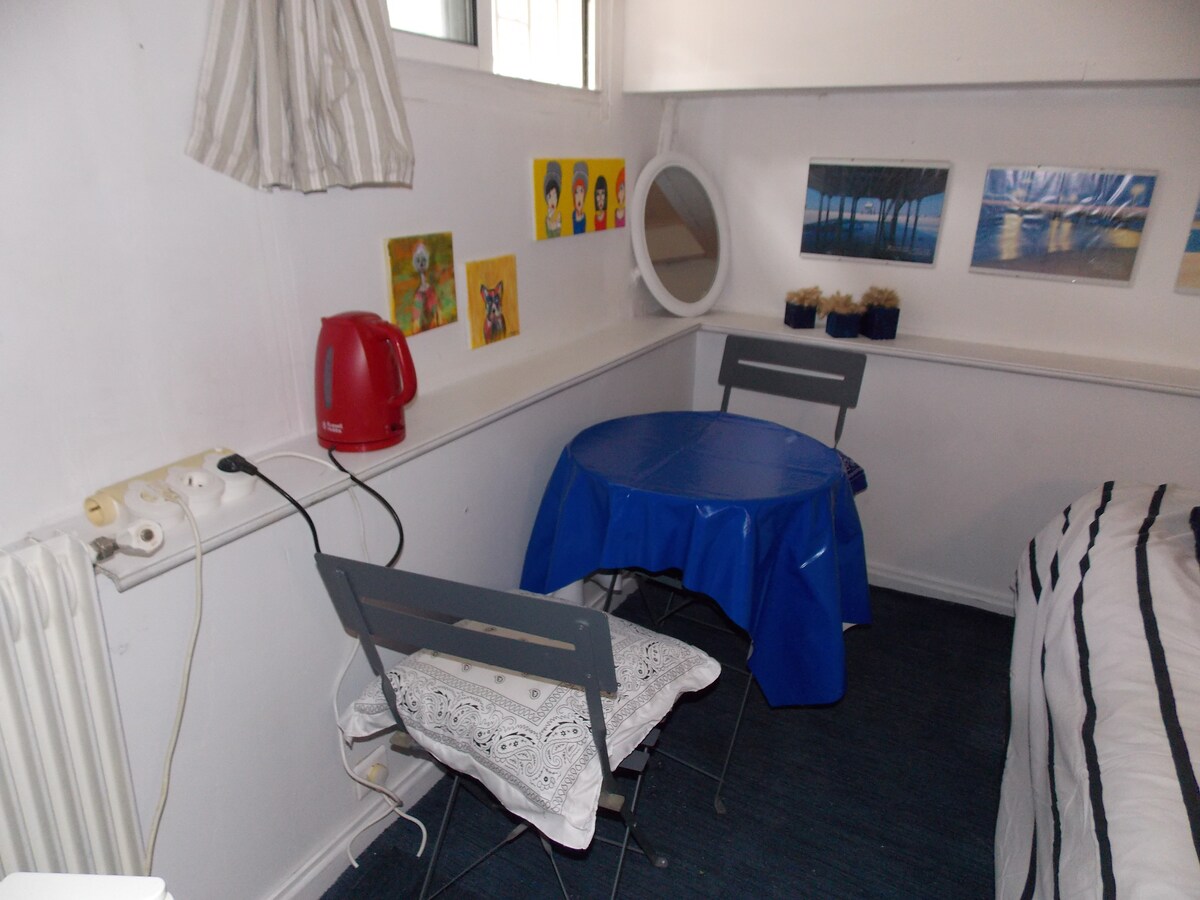 bedroom with BATHROOM and toilet , independent entrance, ceiling height 1.80 m . The beach is 800M AWAY ,with restaurants , bars , grocery store , and bakery . We have two dogs ,a shih tzu ( odile) and a Finnish from Lapland ( ace) they are adorable