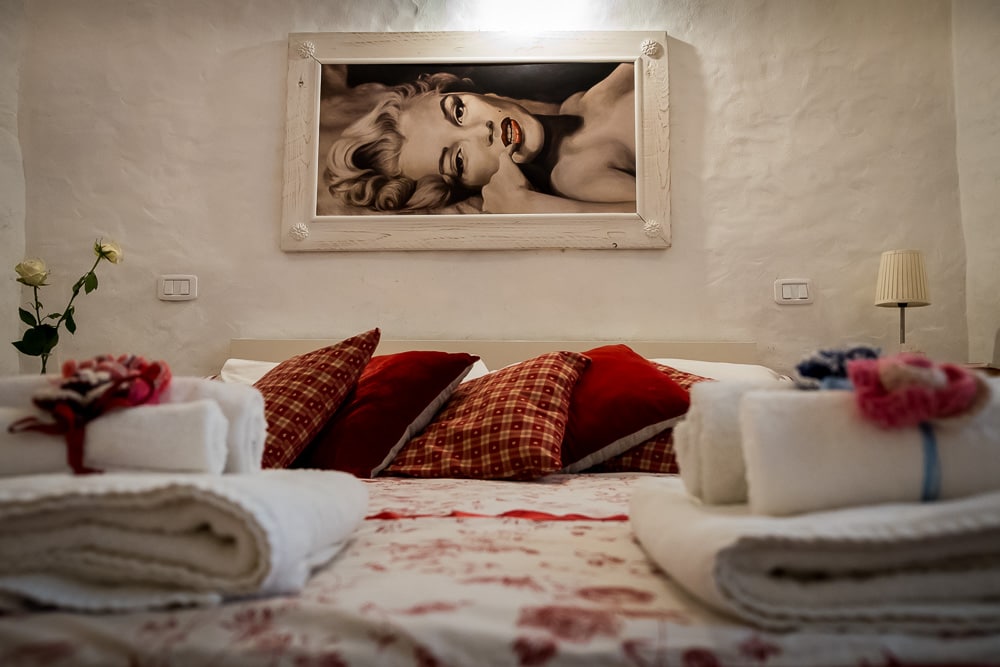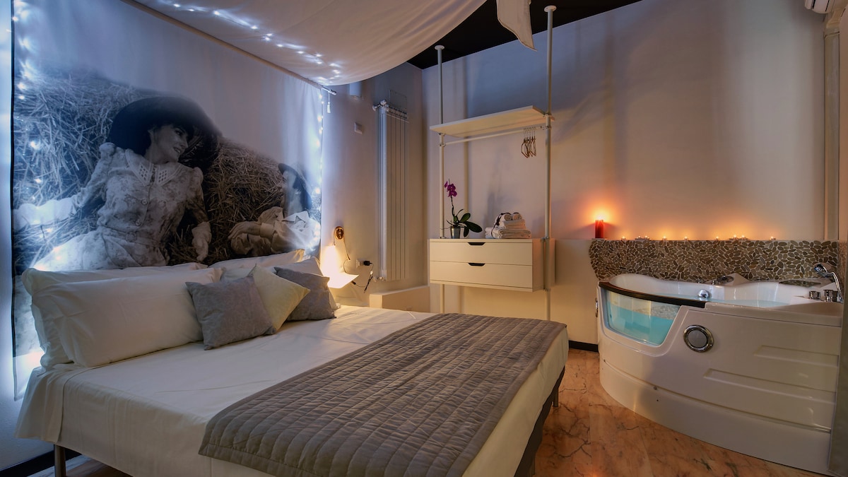 The Princess room in B&B 52cento in the heart of Arezzo is a room dedicated to the movie "Life is Beautiful", shot in Arezzo. Behind the four-poster bed a photo of a scene with Benigni. The bathtub is for 2 people with color changing lights, the bed can be double or single. The bathroom is private, with shower.