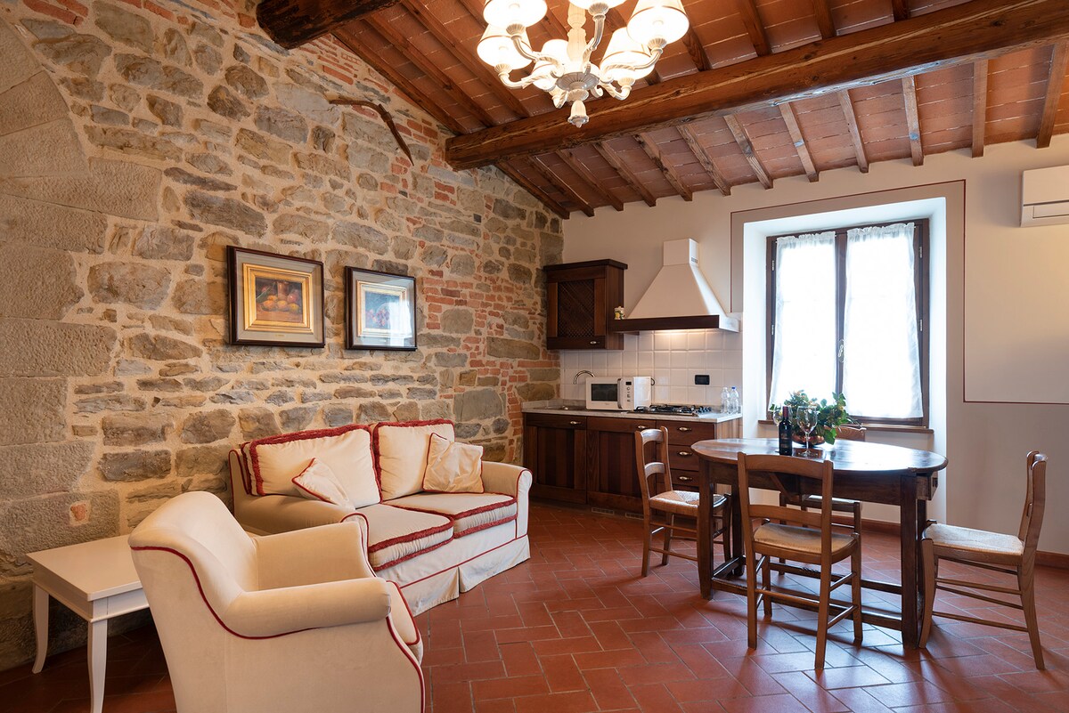 This large stone farmhouse is characterized by its location: set in a large garden from which you can enjoy the splendor of the vineyards of the estate and a breathtaking view of the city of Arezzo. The building is divided into 6 small apartments, delightful and bright accompanied by a simple and traditional decor. In a single room you will find the sleeping area consisting of a wrought iron bed, bedside tables, a small living room and the TV with 32-inch screen. The living area is arranged with a small and cozy kitchen, table, stools and a wood stove with colorful tiles that will make the time warm and unique.