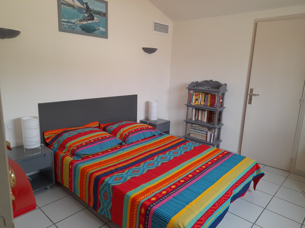 The bedroom has a 160x190 double bed and 1 90x190 single bed, air conditioning, shower room and toilet, TV, WiFi, refrigerator, microwave, table, balcony terrace with deckchair, access to the heated outdoor pool and garden
