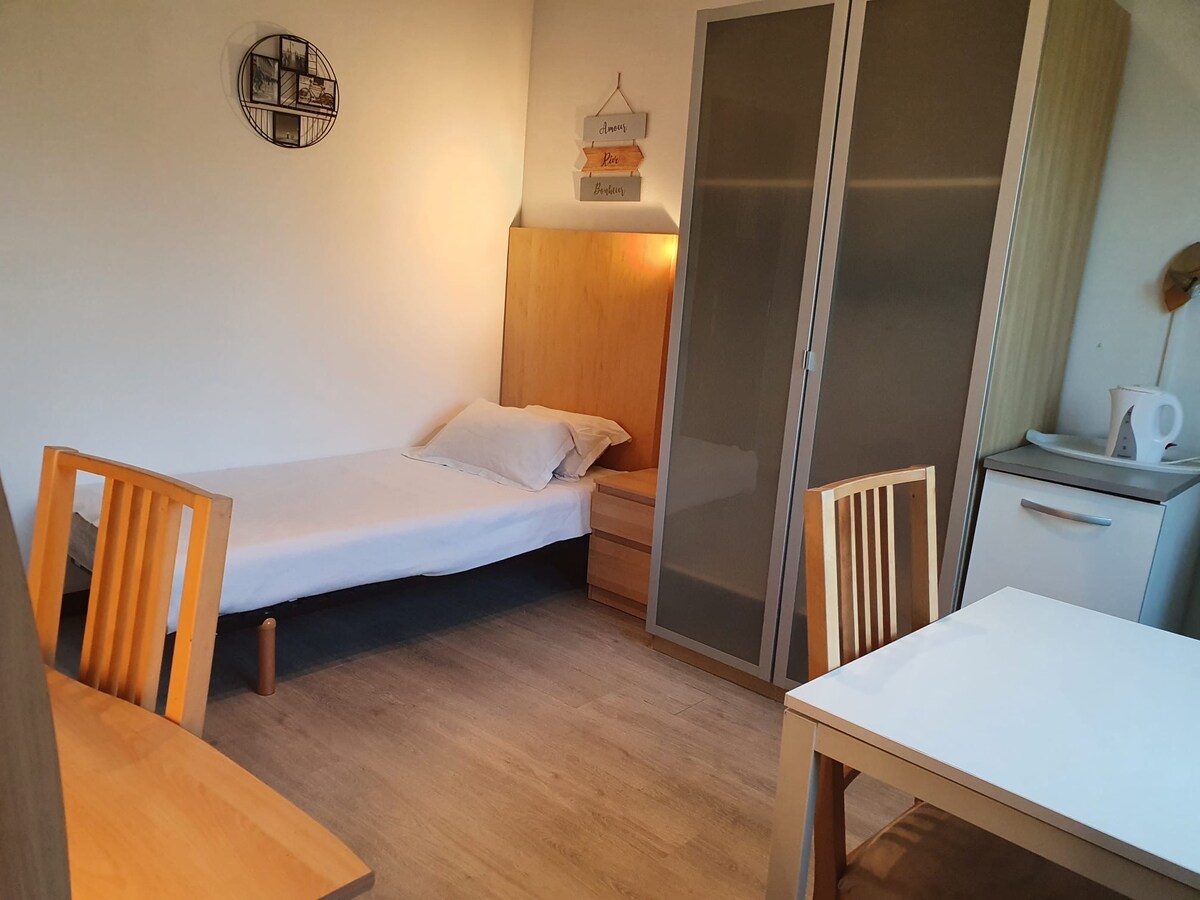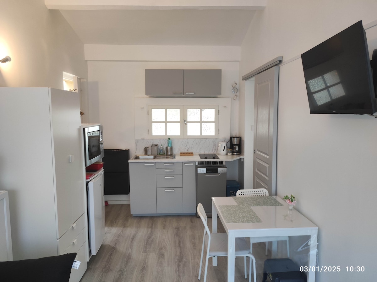 Upon your arrival, I will welcome you and settle in your apartment equipped with a terrace, including a living room with: 80 cm led TV, sofa bed, table and chairs, and the well-equipped kitchen area.