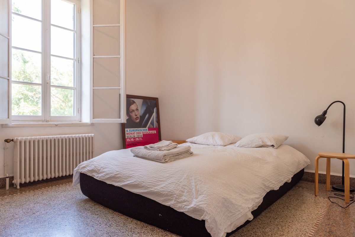 First floor (one flight of stairs up from ground): Bedroom 1 (with a bathtub), plus the common living room with fireplace and piano, couches and armchairs. Perfect for cozying up with a book.