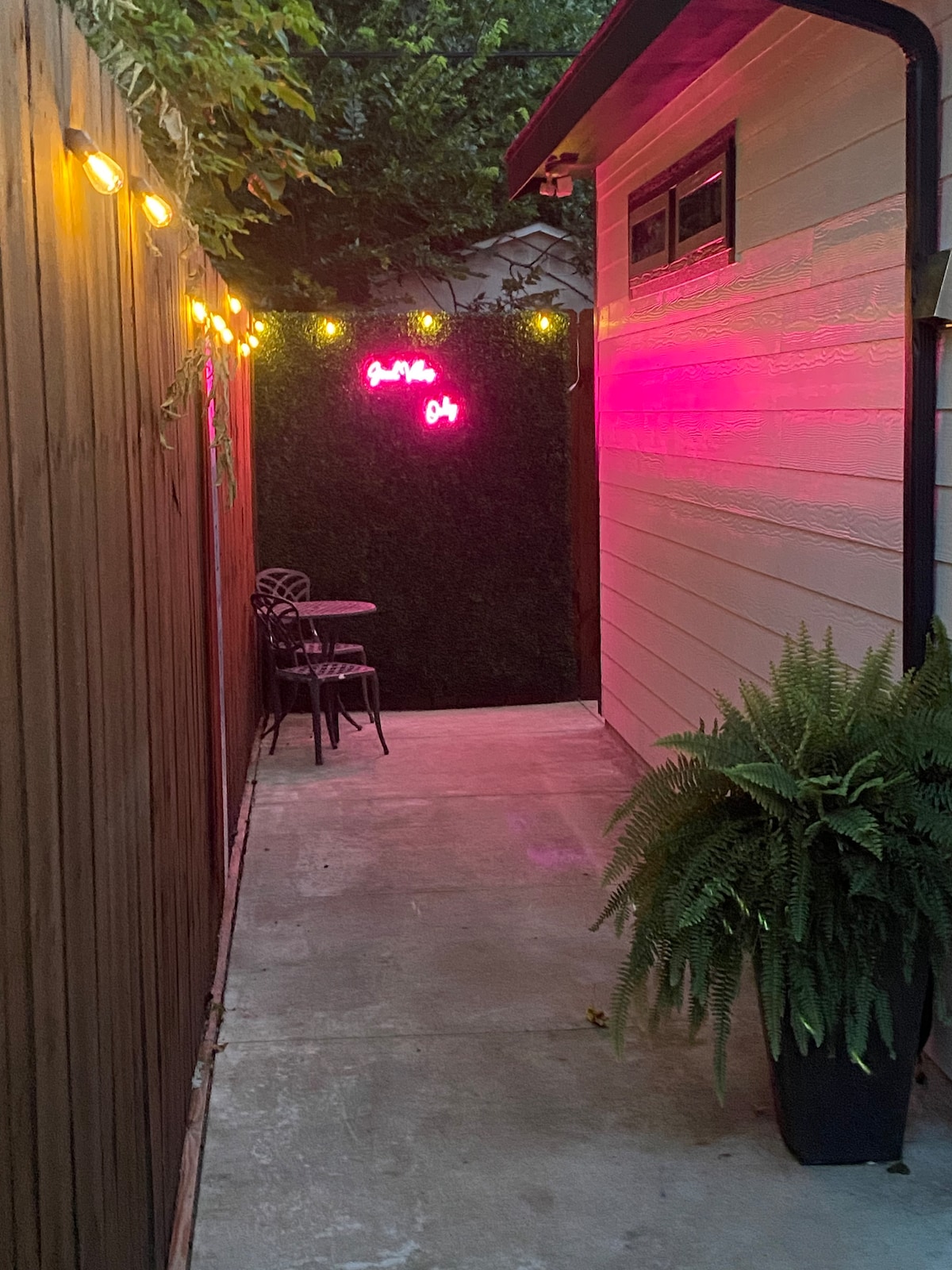Great little full guest house for your stay in historic downtown Mansfield! Features a private, fenced backyard with turf, cafe lights, seating and tv.