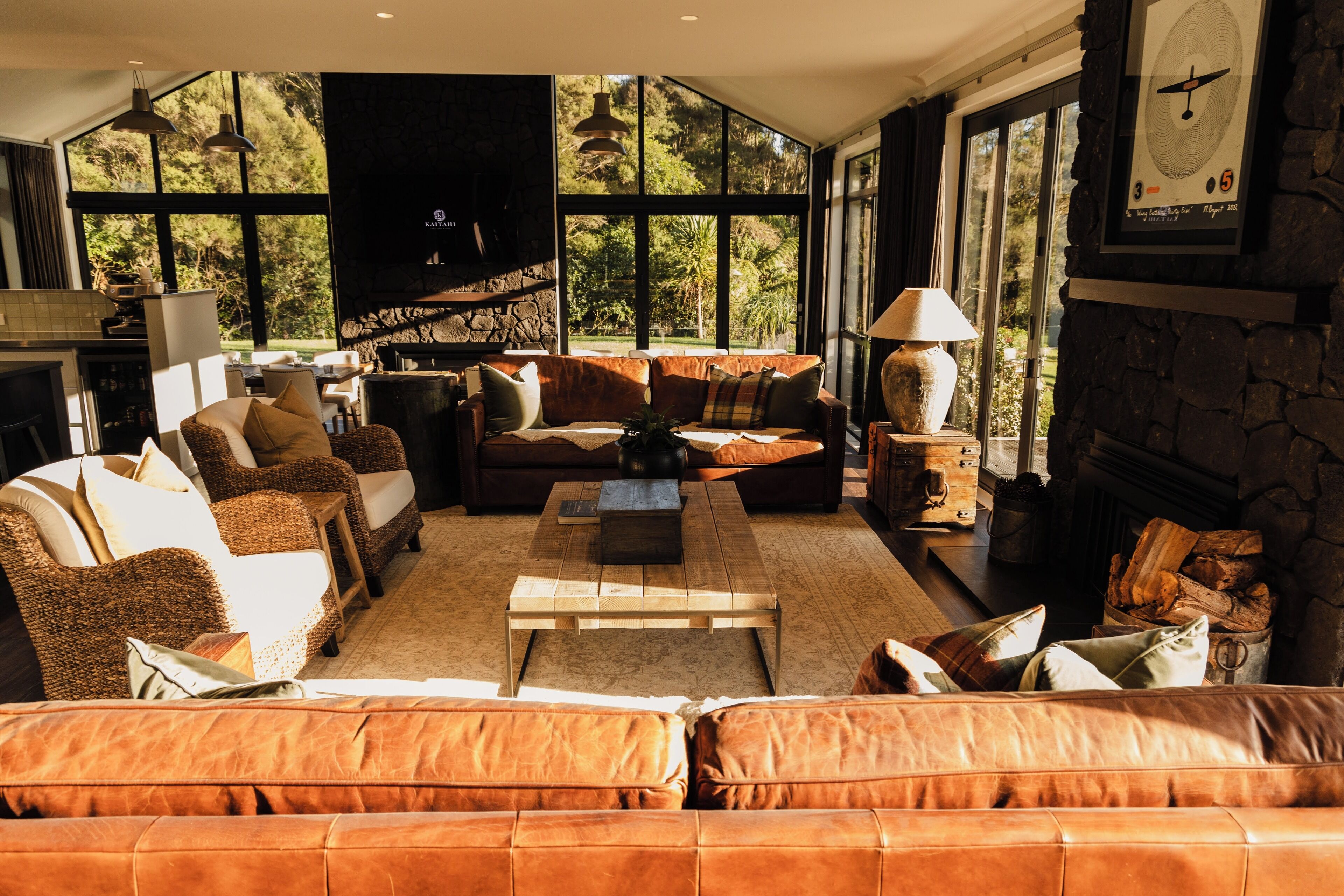 Nestled amid native bush, this luxury lodge offers an idyllic retreat. The lodge accommodates up to six guests across its three suites. The dining room seats 26 guests and has stunning views of the natural surroundings. The property boasts a glass-walled wine cellar and a 19-seated cinema.