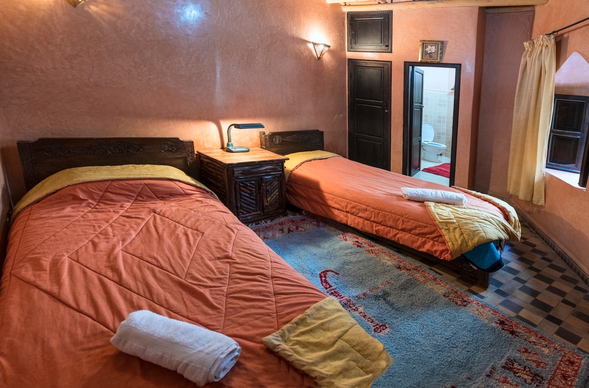 Our comfortable double rooms are just the right size if you are traveling alone or with your friends. With us, you stay at the bottom of the impressive High Atlas mountains while enjoying maximum comfort.