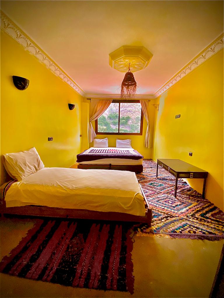Triple Hotel Rooms with shared bathrooms are available for three people in Aroumd village. Toubkal room for Toubkal Atlas trekking in triple room (3 persons). Pet-friendly Hotel Morocco.