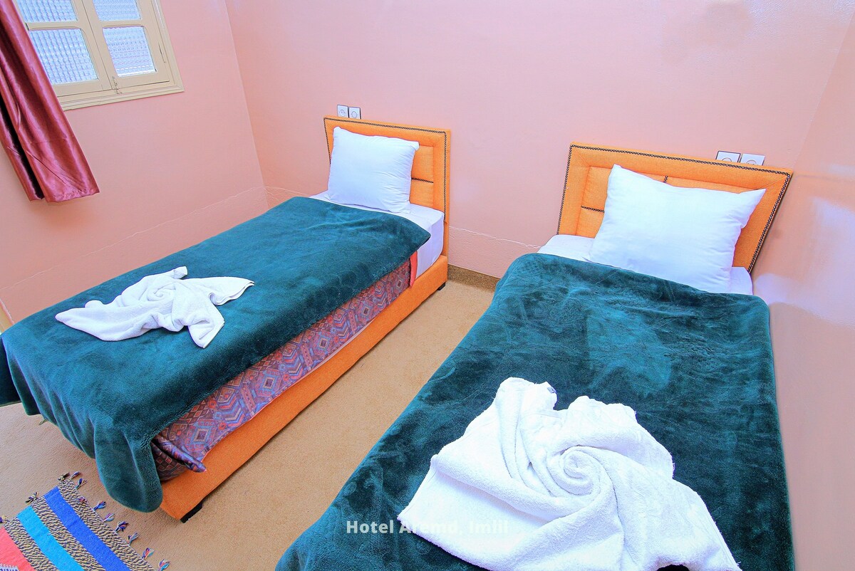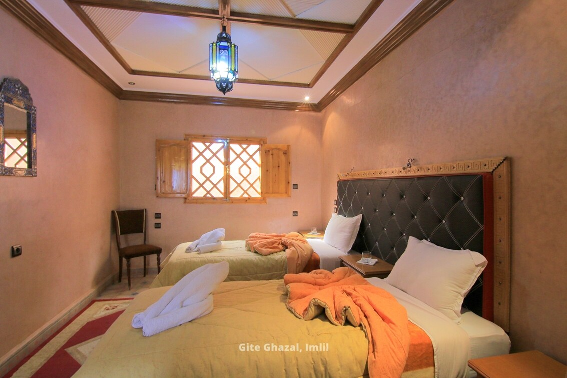 Double Twin Room with TV & A/C & Private Bathroom in Hotel Ghazal in Imlil, Morocco.
