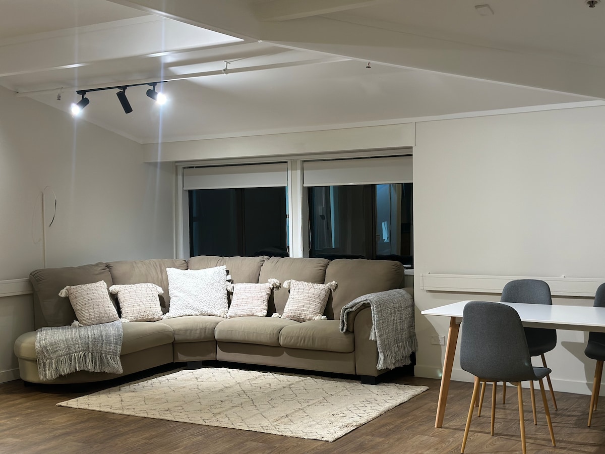 Our guesthouse is situated in a loft above our garage, with its own access. It is a large open studio space with a Queen bed, sofa bed, TV, kitchenette with toaster, fridge, microwave, sandwich press and kettle, wi-fi, iron and ironing board and hairdryer. Note there are no stove (oven or hob) facilities.